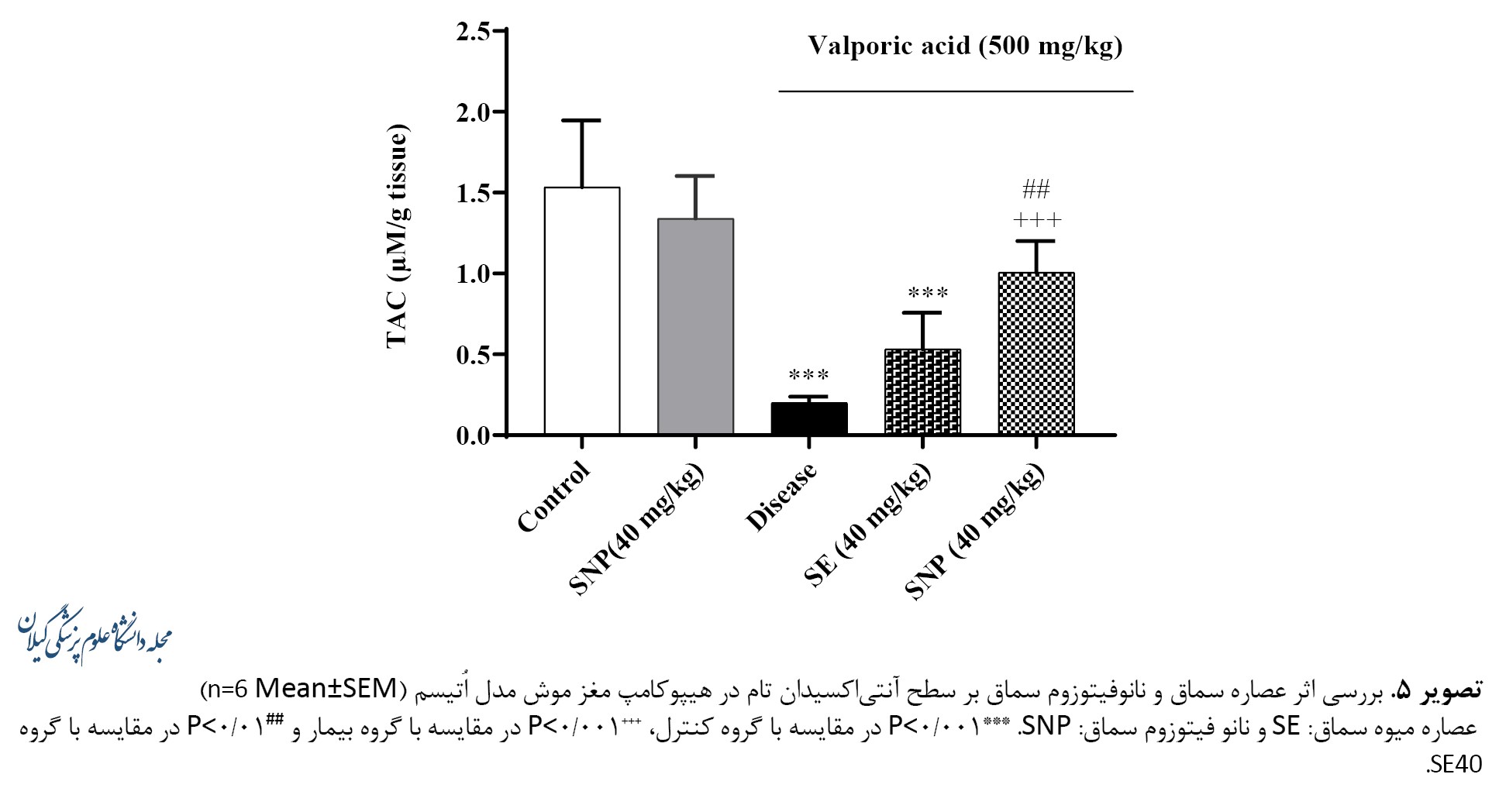 تصویر شماره 5 نشان میدهد که سطح آنتیاکسیدان تام هیپوکامپ بین گروه کنترل و کنترل مثبت اختلاف معنیداری وجود ندارد اما در گروه آزمایش کاهش معنیدار (001/P>0) نسبت به گروه کنترل نشان داده است.