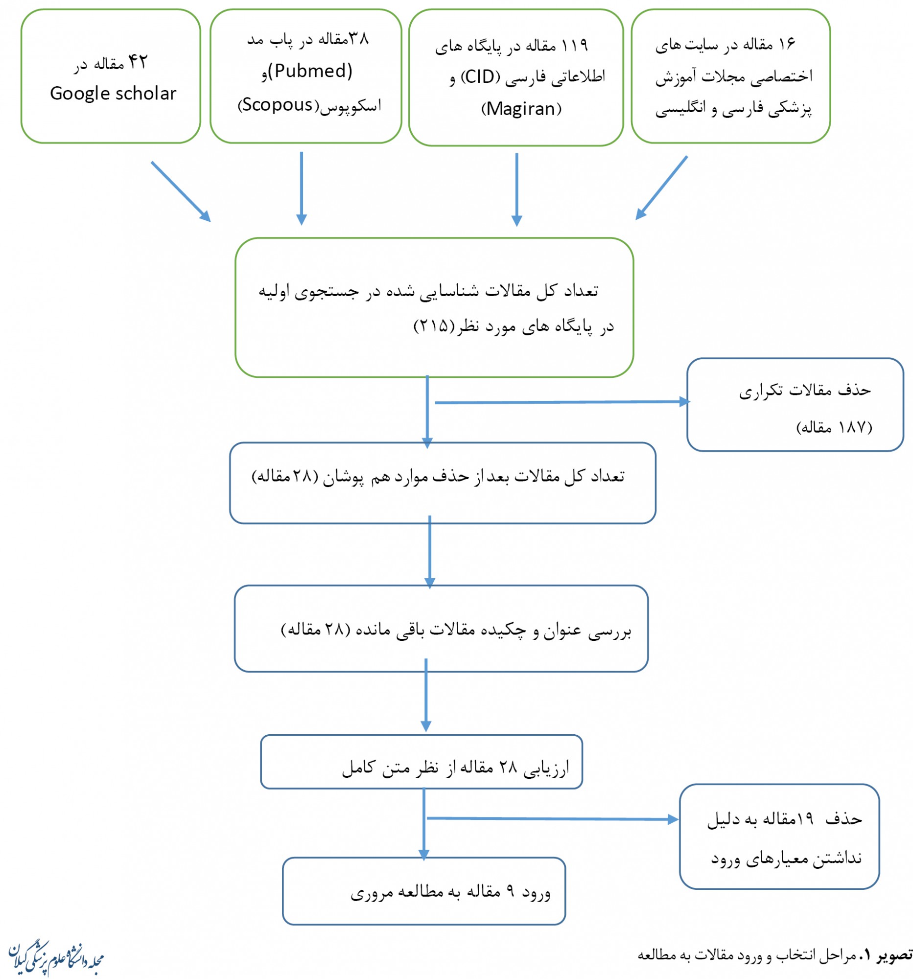 در جستوجوی اولیه 215 مقاله یافت شد که با سبک یادگیری دانشجویان مامایی در ارتباط بودند. از موارد ذکرشده، 42 مورد در گوگل اسکولار، 38 مقاله در پاب مد و اسکوپوس یافت شد. در پایگاههای اطلاعاتی فارسی شامل پایگاه مگایران و پایگاه علمی جهاد دانشگاهی نیز به ترتیب 26 و 93 مقاله یافت شد. مابقی مقالات از جستوجو در سایتهای اختصاصی مجلات آموزش پزشکی فارسی و انگلیسی با استفاده از کلیدواژههای مناسب به دست آمد.