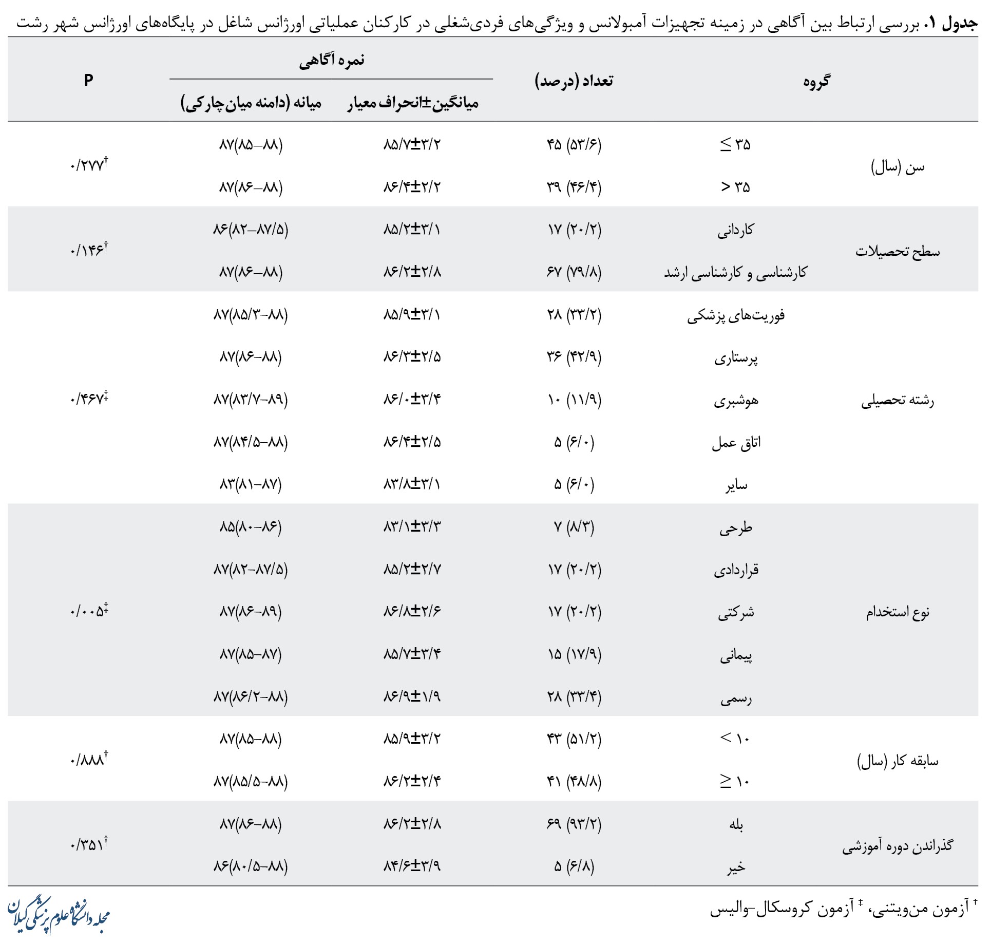 در این مطالعه، سطح آگاهی و ارتباط آن با ویژگیهای فردی و شغلی کارکنان عملیاتی اورژانس پیشبیمارستانی شهر رشت از تجهیزات داخل آمبولانس مورد بررسی و تحلیل قرار گرفت. همه 84 نفر کارکنان اورژانس 115، مرد بودند. در مطالعه جان و همکاران که در ازبکستان انجام شد، 74/5 درصد مرد بودند [