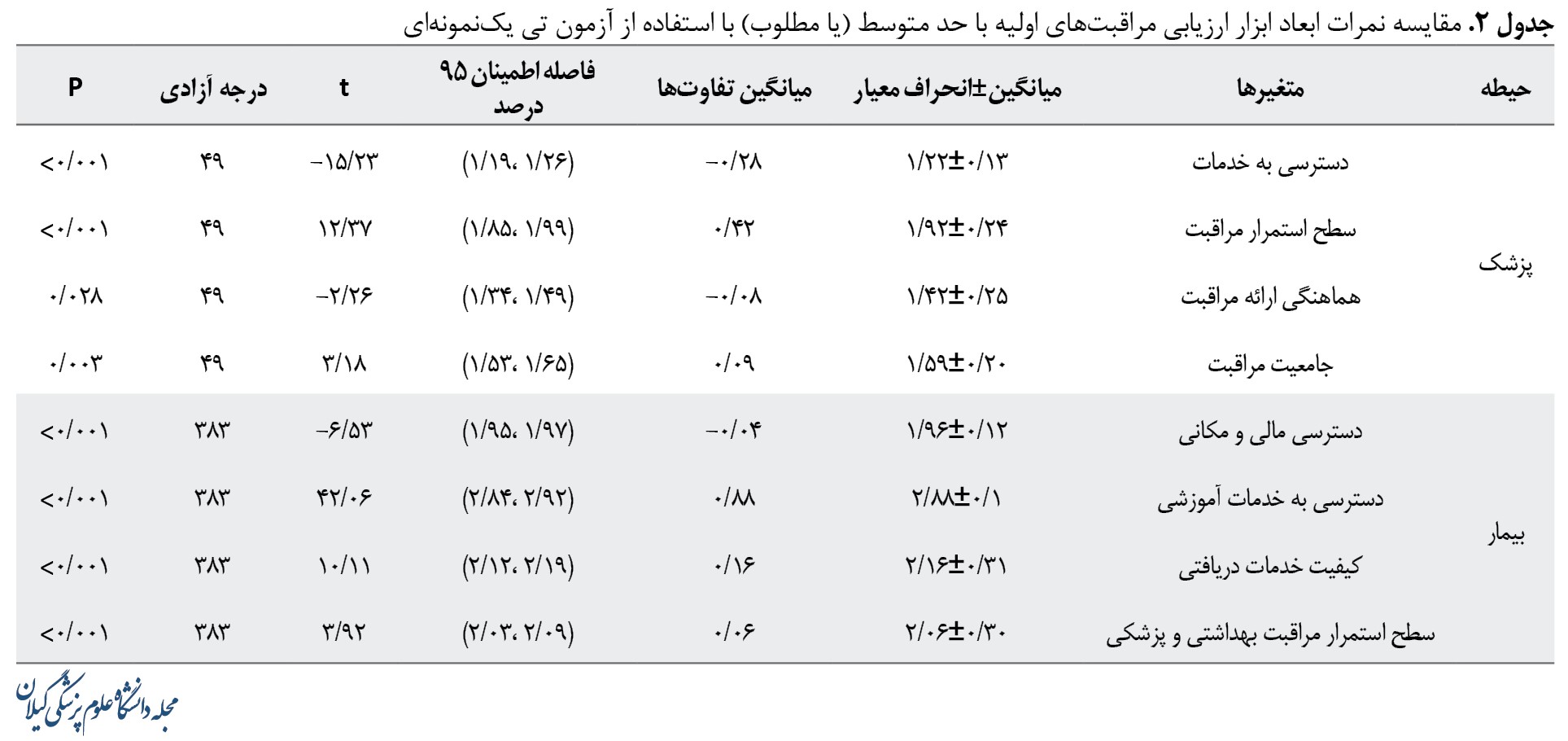 جدول شماره 2 مقایسه نمرات ابعاد ابزار ارزیابی مراقبتهای اولیه با حد متوسط (یا مطلوب) با استفاده از آزمون تی یکنمونهای انجام شده است.