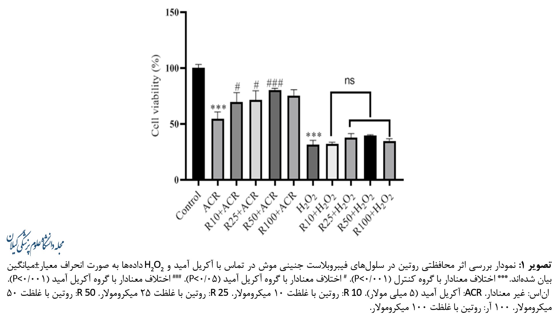 روتین در همه غلظتها زنده ماندن سلولهای تحت درمان با آکریل آمید را نسبت به گروه آکریل آمید افزایش داد (05/P<0). همانطور که اطلاعات نشان میدهد، H2O2 به عنوان کنترل مثبت نیز زنده ماندن سلولها را به صورت معنادار نسبت به گروه کنترل کاهش داد (05/P<0). بر اساس نتایج بهدست آمده از MTT با توجه به این که بیشترین اثر محافظتی در غلظت 50 میکرومولار روتین مشاهده شد، این غلظت بهعنوان غلظت مؤثر در سایر تستها مورد استفاده قرار گرفت (