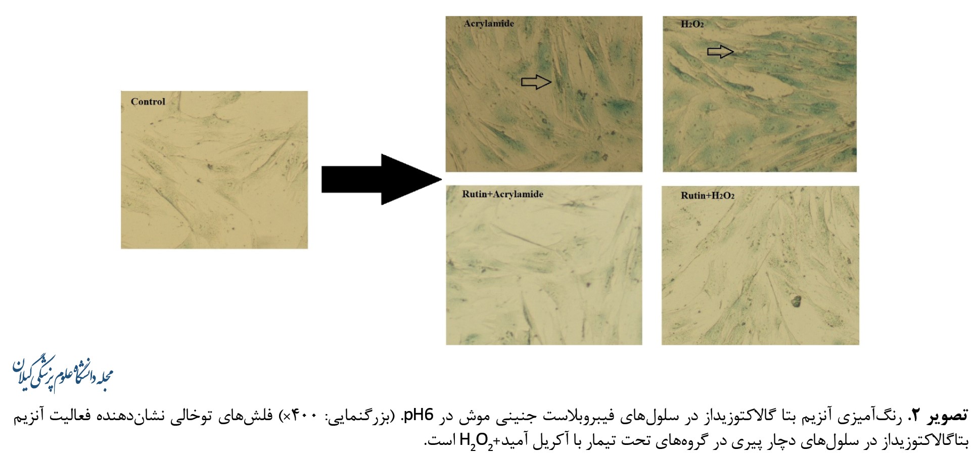 تصویر شماره 1 مشخص شده است، تجمع بیشتر رنگ سبز-آبی در سلولهای تحت درمان با آکریل آمید و H2O2 (مشخص شده با فلش توخالی) در مقایسه با گروه کنترل مشاهده میشود که نشانگر افزایش در سطح فعالیت بتا گالاکتوزیداز میباشد. از طرف دیگر، تیمار سلولها با روتین، موجب کاهش سطح فعالیت گالاکتوزیداز و در نتیجه کاهش تجمع رنگ شده است که این تغییر در گروههای روتین+آکریل آمید و روتین+H2O2 قابل مشاهده میباشد (