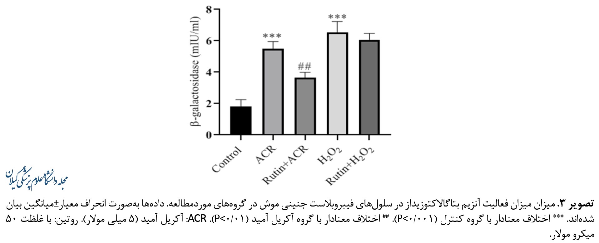 بررسی فعالیت آنزیم بتاگالاکتوزیداز نشان داد گروه آکریل آمید و H2O2 دارای اختلاف معنادار با گروه کنترل (05/P<0) است که نشاندهنده اثر القایی آن در فرایند پیری سلولی میباشد. خوشبختانه تیمار سلولها با روتین (در گروه روتین+آکریل آمید) به شکل چشمگیری این فعالیت را نسبت به گروه تحت تیمار با آکریل آمید به تنهایی کاهش داد (05/P<0) و بیانگر این موضوع است که روتین میتواند در فرایند پیری اثر محافظتی داشته باشد (