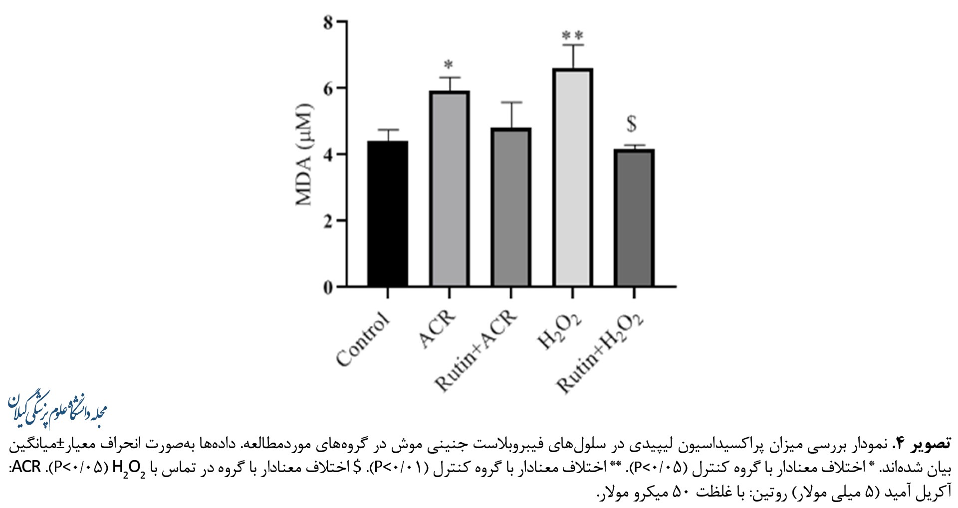 در گروههای روتین+آکریل آمید و روتین+ H2O2 میزان MDA به طور معناداری کمتر از گروه آکریل آمید به تنهایی و H2O2 به تنهایی بود (05/P<0) (
