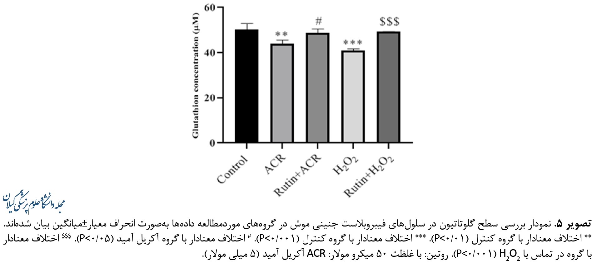 استفاده از روتین+آکریل آمید نسبت به گروه آکریل آمید بهطور چشمگیری موجب بهبود این آسیب شد و سطح گلوتاتیون بالاتری را موجب شد (05/P>0). مشابه این اتفاق در گروههای تحت درمان با H2O2 و روتین+ H2O2 مشاهده شد (05/P<0) (