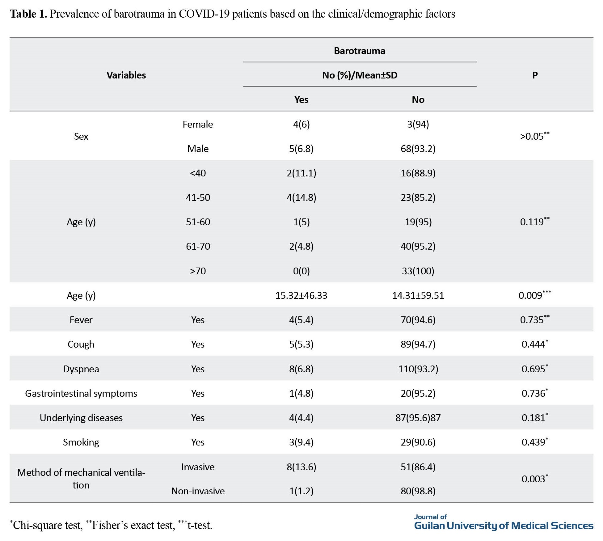 8]. Due to the resurgence of COVID-19 disease and increase in the number of hospitalizations, in this study, patients diagnosed with COVID-19 hospitalized in the intensive care unit of Rasht educational and therapeutic hospitals were examined for the occurrence of barotrauma.