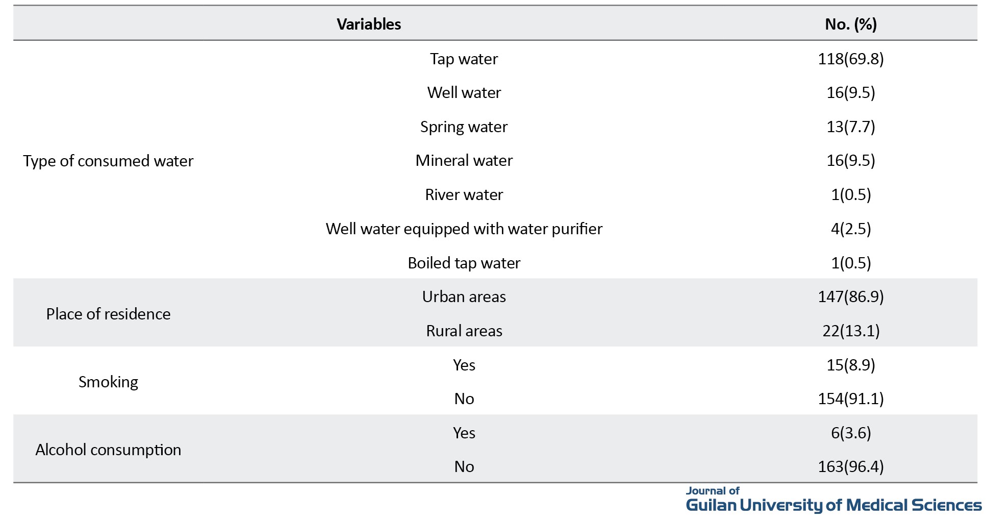 This cross-sectional study was conducted in 2017 in Guilan province of Iran. A total of 169 patients were enrolled 3 to 5 years after eradication treatment. The H pylori infection was determined by an endoscopy procedure (combination of rapid urease test with histology or histology alone). The successful H. pylori eradication was confirmed by a Urea Breath Test (UBT) 8 weeks after the end of H. pylori eradication therapy. Inclusion criteria were: no use of Proton pump inhibitors (PPIs) in the last two weeks and not taking antibiotics and bismuth in the last four weeks. Second UBT was performed for all subjects 3-5 years after the end of therapy using carbon-14 UBT. Before the second UBT, the patients’ characteristics including age, gender, occupation, education, smoking, alcohol consumption, type of consumed water, and place of residence (urban or rural) were surveyed using a standardized questionnaire by interview. From patients’ medical records, following information were obtained: type of medication regimen, the initial diagnostic method to confirm the presence of H. pylori, and secondary diagnostic method to confirm eradication after treatment.