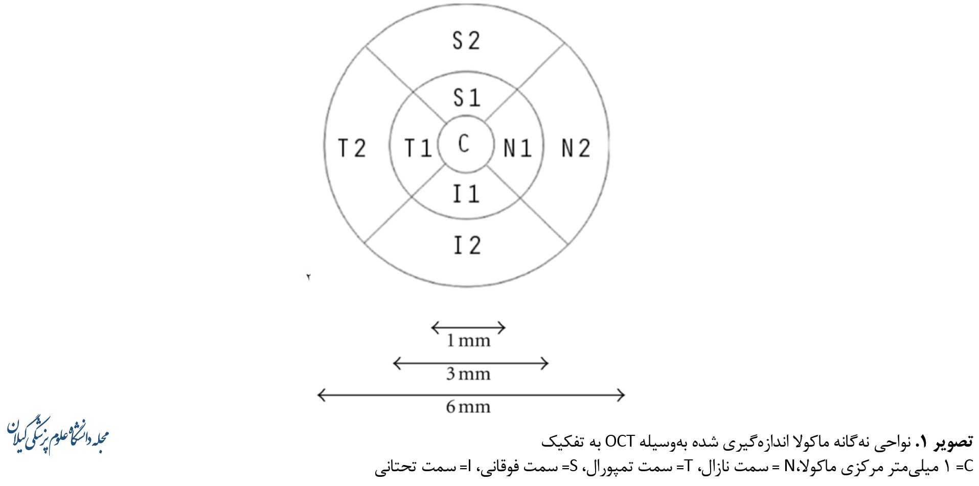 پیشنویس این تحقیق را کمیته اخلاق دانشگاه علومپزشکی گیلان ارزیابی و تصویب کرد (تأییدیه شماره 3/132/2415/پ مورخ 1400/9/28) و تمام اصول اخلاقی هلسینکی رعایت شد. بعد از اخذ رضایت کتبی از بیماران، ابتدا یک چشم از هر بیمار بهطور تصادفی انتخاب شد. قبل از ریختن قطره گشادکننده مردمک، یک چشمپزشک ضخامت ماکولا را 3 بار با فاصله 10 دقیقه و با استفاده از دستگاه Spectral domain Cirrus OCT (نسخه نرمافزار 4/0، مدل 400، Carl Zeiss Meditec, Inc، Dublin، CA، USA) با پروتکل 6 در 6 میلیمتر، Macular cube 512 در 128 scan کرد. هر تصویر، رزولوشن آگزیال 5 میکرون و رزولوشن عرضی 10 میکرون داشت. هر cube از 128 خط معاینه افقی از 512 اسکن A تشکیل شده است. سرعت اسکن A-scan 27000 در ثانیه است. همانند فیلدهای مطالعه رتیوپاتی دیابتی در درمان اولیه ضخامت ماکولا در نواحی نهگانه تفکیکی، بهصورت جداگانه ارزیابی شد. برای مشخص کردن حلقه 1 میلیمتری مرکزی از حرف C، حلقه 3 میلیمتری از عدد 1 و حلقه 6 میلیمتری از عدد 2 استفاده شد. برای مشخص کردن شبکیه در سمت نازال فووآ از حرف N، سمت تمپورال فووآ حرف T، سمت بالا یا سوپریور فووآ حرف S و سمت پایین یا اینفریور فووآ حرف I استفاده شد (