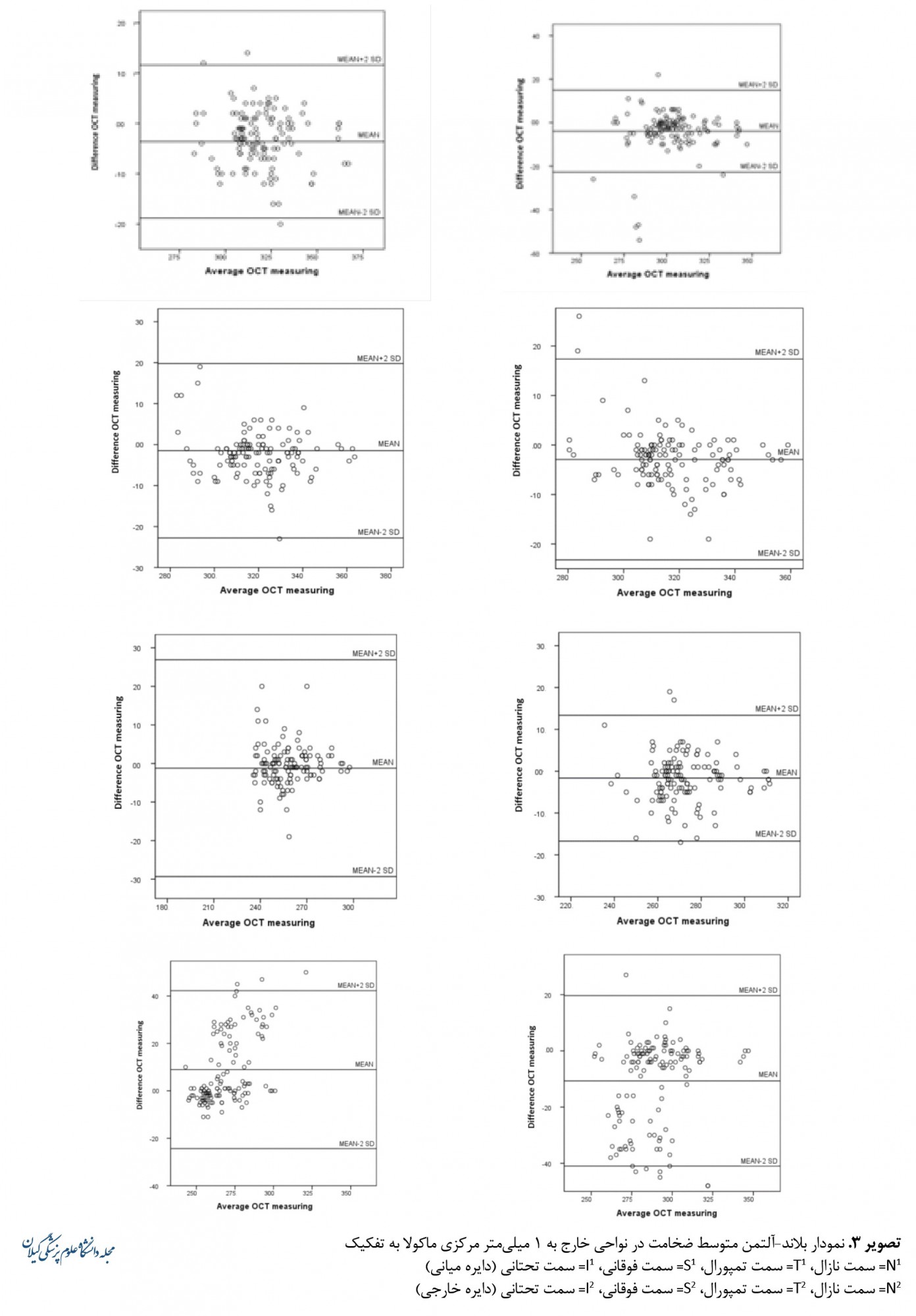 17] در مطالعه خود تکرارپذیری اندازهگیری ضخامت ماکولا را به کمک دستگاه Cirrus Fourier-domain OCT در 72 چشم ارزیابی کردند. اندازهگیریها بدون گشاد کردن مردمک انجام شد. بهطورکلی نشان داده شد که این دستگاه تکرارپذیری بسیار بالایی دارد. آنها نشان دادند که ناحیه N1 در بین نواحی نهگانه بیشترین تکرارپذیری را دارد (ضریب همبستگی داخلی=0/992) که با مطالعه ما همخوانی دارد.