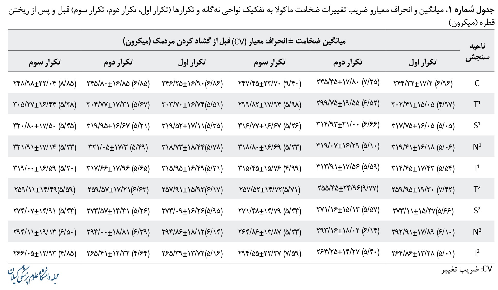 در این مطالعه بیشترین تکرارپذیری قبل از قطره در ناحیه N1 با قدر مطلق میانگین اختلاف 3 اندازهگیری 48/2±4/2 4 و ضریب همبستگی داخلی= 0/99 (فاصله اطمینان 95 درصد، 0/994-0/983) و بیشترین تکرارپذیری پس از قطره در ناحیه C با قدر مطلق میانگین اختلاف 3 اندازهگیری 6/9±4/42 و ضریب همبستگی داخلی=0/95 (فاصله اطمینان 95 درصد، 0/971-0/943) به دست آمد. در نواحی N2 و I2 از نظر آماری قدر مطلق میانگین اختلاف 3 اندازهگیری تفاوت معنیداری داشت. بروس و همکاران [