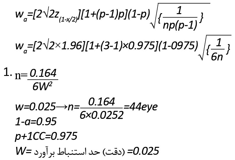 فرمول شماره 1 و با در نظر گرفتن حد اشتباه برآورد WA=2/5 (درصد) جهت تعیین پایایی اندازههای OCT به تعداد 44 نفر برآورد شده است.