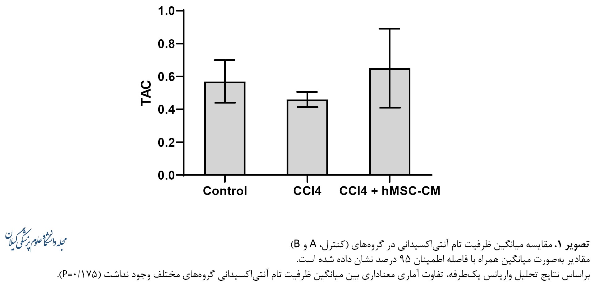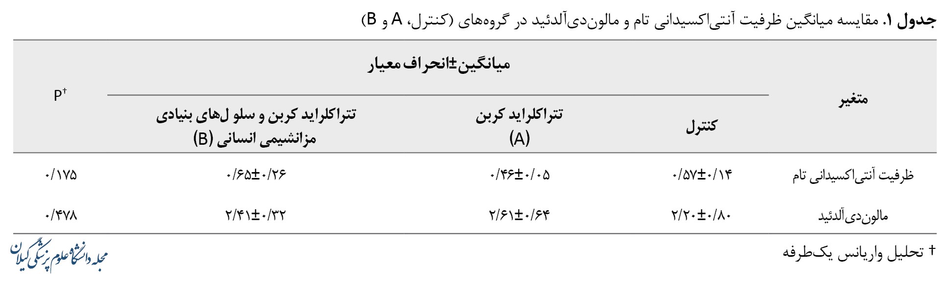 تصویر شماره 1 ارائه شده است، براساس تحلیل واریانس یکطرفه، بین گروههای مطالعهشده ازنظر ظرفیت تام آنتیاکسیدانی تفاوت آماری معناداری وجود نداشت (0/175=P)؛ نتیجه مشابهی برای مالوندیآلدئید نیز یافت شد (0/478=P) (