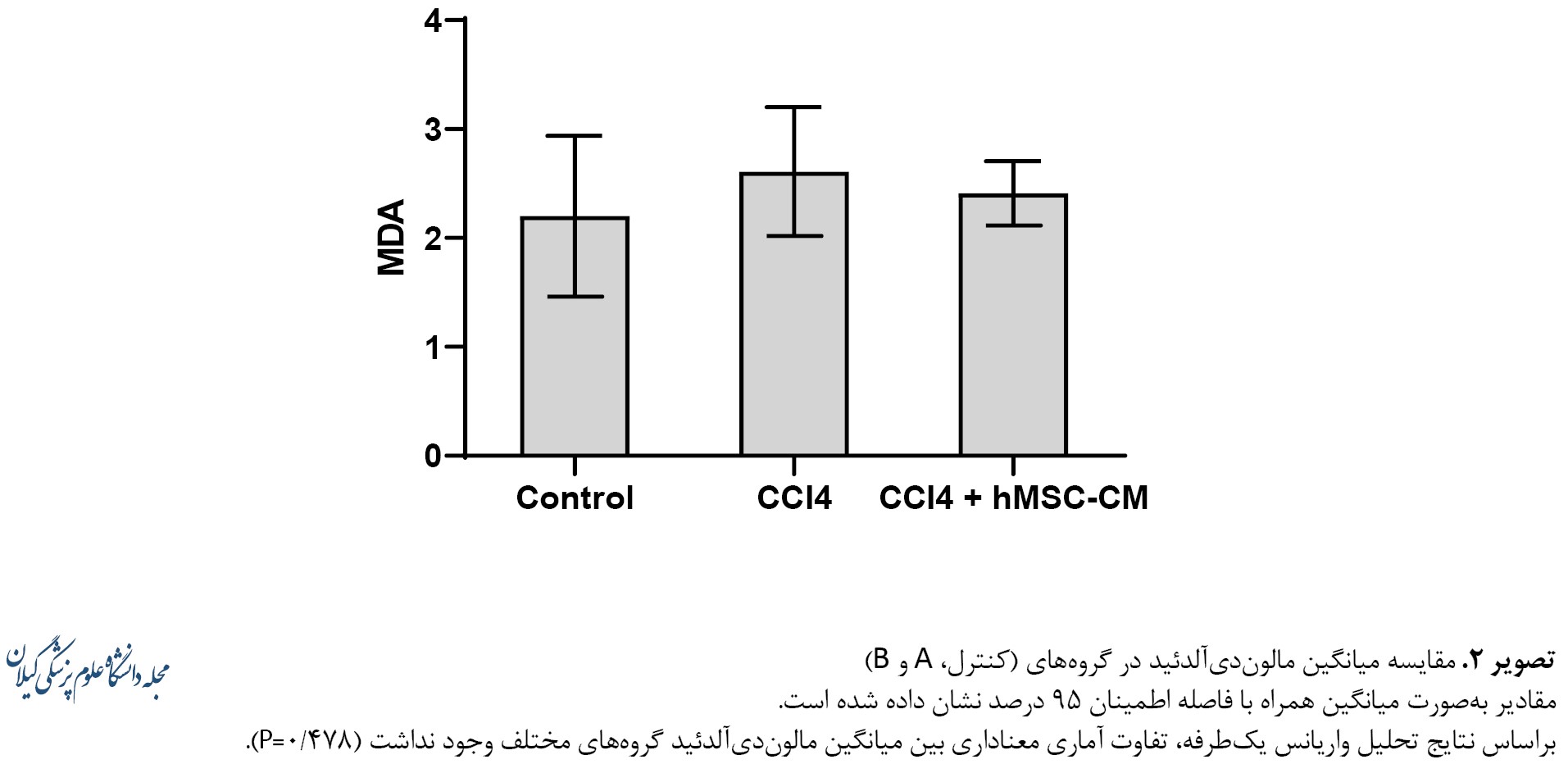 32]. باتوجهبه تأثیر تتراکلرید کربن در تولید گونههای اکسیژن فعال، سطح بالای مالوندیآلدئید طبیعی است. باتوجهبه اینکه مالوندیآلدئید محصول نهایی گونههای اکسیژن فعال است.در مطالعه جیانگ و همکاران [