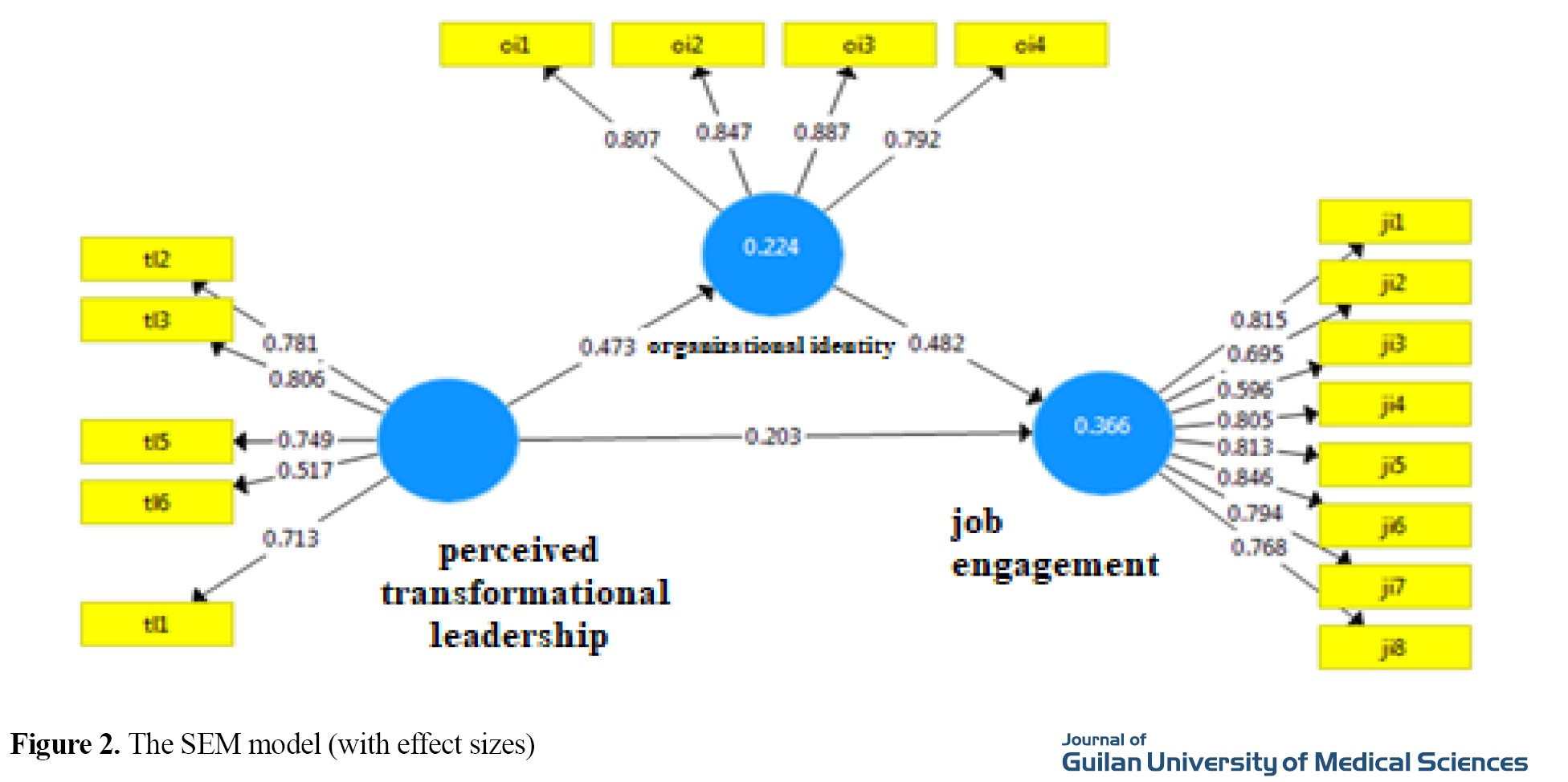 Transformational leadership had a significant effect on the work engagement of nurses, since t=3.459, which was >1.96. The effect size was 0.203. Organizational identification had a significant effect on the work engagement of nurses, since t=8.490, which was >1.96. The effect size was 0.482.