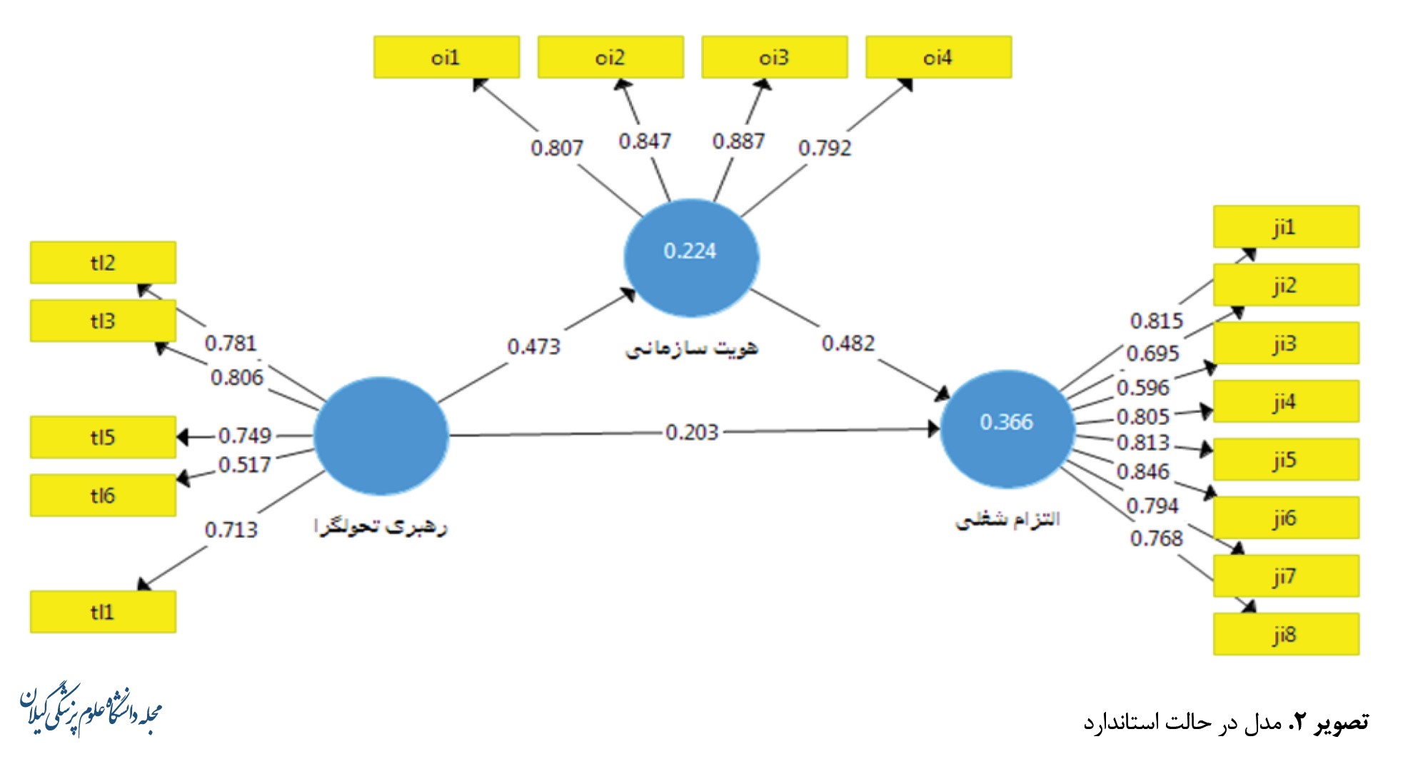 فرضیه دیگری که در این بین مورد بررسی و تأیید قرار گرفت، تأثیر هویت سازمانی بر روی التزام شغلی است (0/482) و البته تأیید نقش میانجیگر هویت سازمانی به میزان 0/529 است و این یافته نیز با پیشینه مطالعاتی همراستا است. بنابراین با افزایش رهبری تحولگرا، هویت سازمانی و به تبع آن، التزام شغلی کارکنان نیز افزایش خواهد یافت و مزایای ناشی از این امر شامل حال افراد سازمان، سازمان و جامعه میشود.
