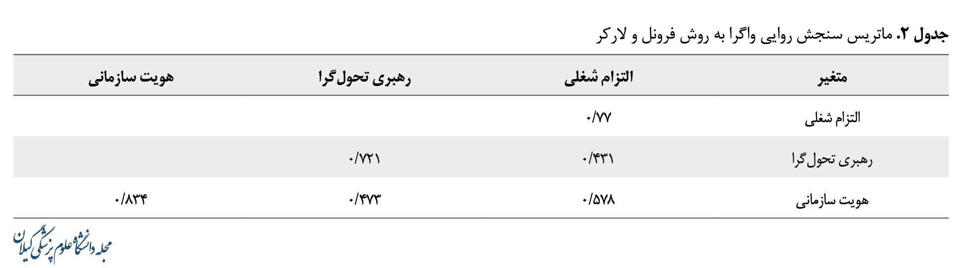 21]. نمونهها براساس طیف 5 گزینهای لیکرت مورد ارزیابی قرار گرفتند. این پرسشنامهها ازنظر روایی محتوا مورد تأیید خبرگان و اساتید هیئت علمی حوزه مدیریت قرار گرفتند. برای بررسی پایایی، از ضریب آلفای کرونباخ استفاده شد که سطح آن در خصوص متغیرهای رهبری تحولگرا، هویت سازمانی، التزام شغلی به ترتیب برابر با 0/816، 0/902، و 0/773 محاسبه شد.