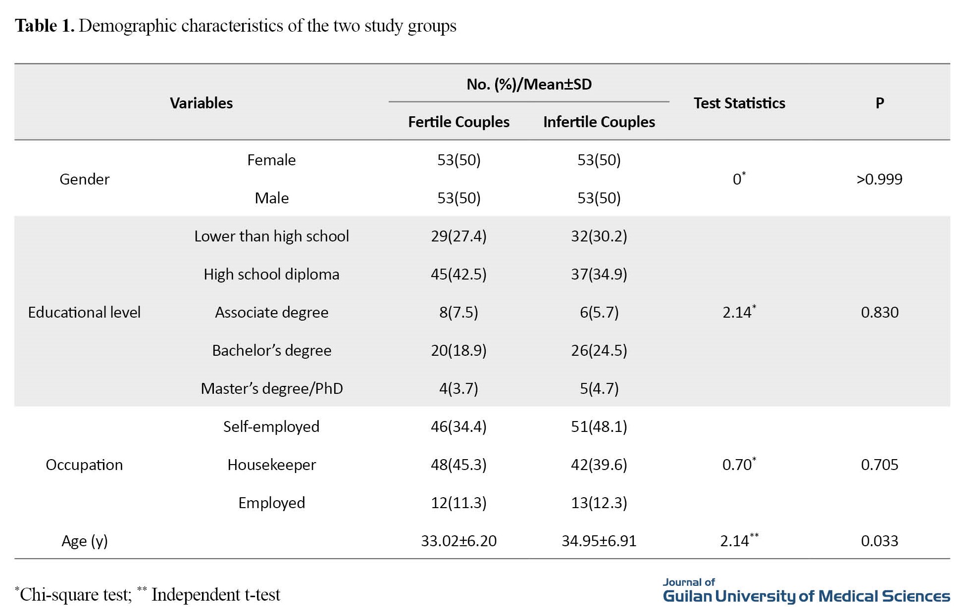The mean age of participants was 34.95±6.91 years in infertile couples and 33.02±6.20 years in fertile couples. This difference was statistically significant (P<0.05) (