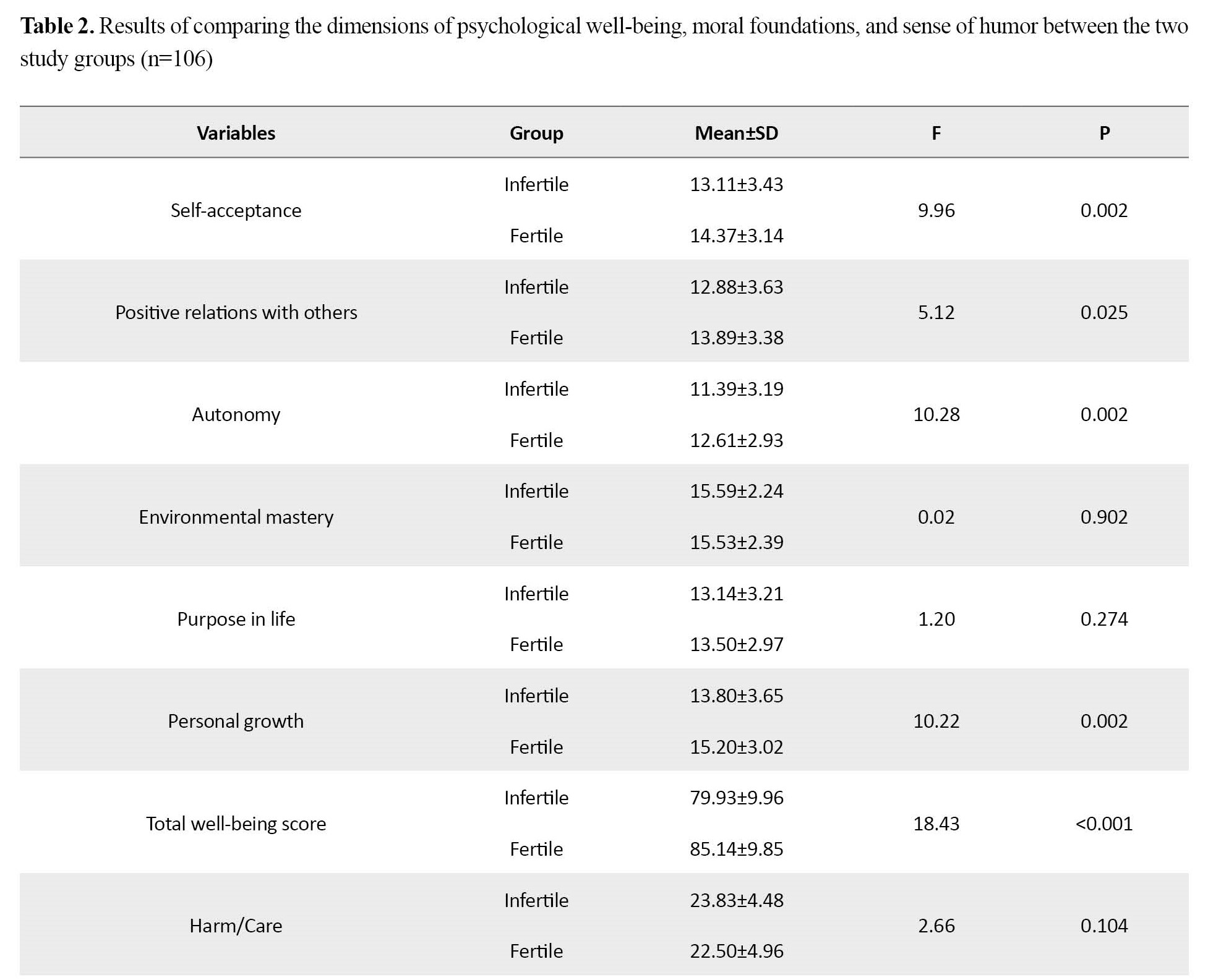 The results of data analysis showed a significant difference between infertile and fertile couples regarding self-acceptance, positive relations with others, autonomy, and personal growth dimensions of psychological well-being and also in the sanctity/purity dimension of moral foundations, the humor creativity and uses of humor for social purposes dimension of sense of humor, and the total score of psychological well-being (