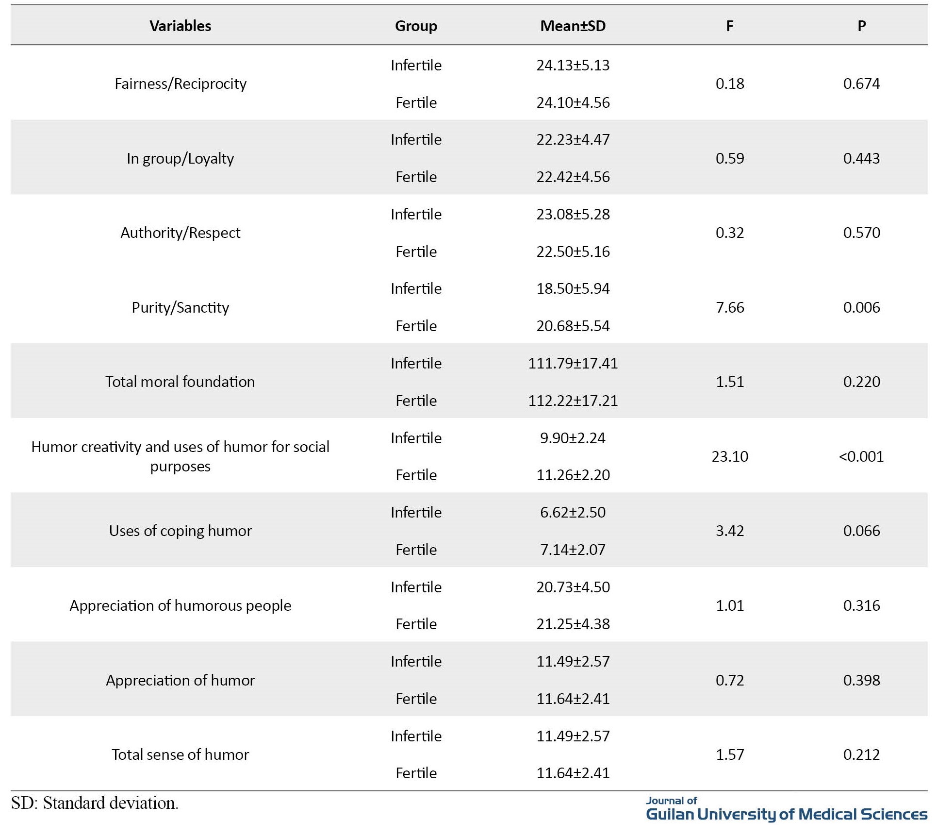 In this causal-comparative study, participants were 212 couples (106 infertile and 106 fertile couples) in 2022. They completed the questionnaire separately. The inclusion includes were the diagnosis of infertility in one of the couples, having a child without a diagnosis of secondary infertility, high school education, resident of Guilan Province, and age 18-45 years for women and 18-50 years for men. The couples who had been married for one year; had education lower than high school; were living in other provinces; and had age <18 or >50 years were excluded. The Ryff’s psychological well-being scale, moral foundations questionnaire, and multidimensional sense of humor scale were used for data collection. For the analysis of the collected data, analysis of covariance was used in SPSS software, version 28.