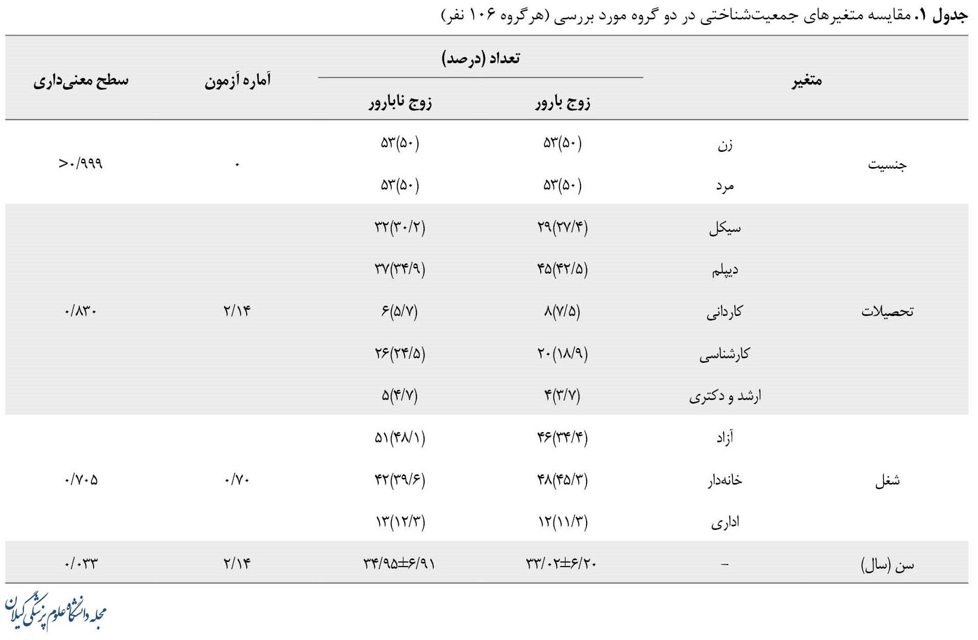 میانگین و انحرافمعیار سن برای گروه زوجین نابارور 6/91±34/95 سال و برای گروه زوجین بارور 6/20±33/02 سال بود. نتایج نشان داد میانگین سن زوجهای بارور و نابارور به طرز معنیداری با هم متفاوت است (0/05>p). هر گروه از زوجین نابارور و بارور از 53 زن و 53 مرد تشکیل شدند. بررسی وضعیت اشتغال نیز نشان داد 39/6 درصد از گروه زوجین نابارور و 45/3 درصد از گروه زوجین بارور بیکار یا خانم خانهدار بودند و 48/1 درصد از زوجین نابارور و 34/4 درصد از گروه زوجین بارور دارای شغل آزاد و 12/3 درصد از گروه زوجین نابارور و 11/3 درصد از گروه زوجین بارور دارای شغل اداری و کارمند بودند. بررسی سطح تحصیلات نیز نشان داد 30/2 درصد از گروه زوجین نابارور و 27/4 درصد از گروه زوجین بارور دارای تحصیلات در سطح زیر دیپلم، 34/9 درصد از گروه زوجین نابارور و 42/5 درصد از گروه بارور دارای تحصیلات در سطح دیپلم، 5/7 درصد از گروه نابارور و 7/5 درصد از گروه بارور دارای تحصیلات در سطح کاردانی، 24/5 درصد از گروه نابارور و 18/9 درصد از گروه بارور دارای تحصیلات در سطح کارشناسی و مابقی آزمودنیها در دو گروه دارای تحصیلات در سطح کارشناسیارشد و دکتری بودند (