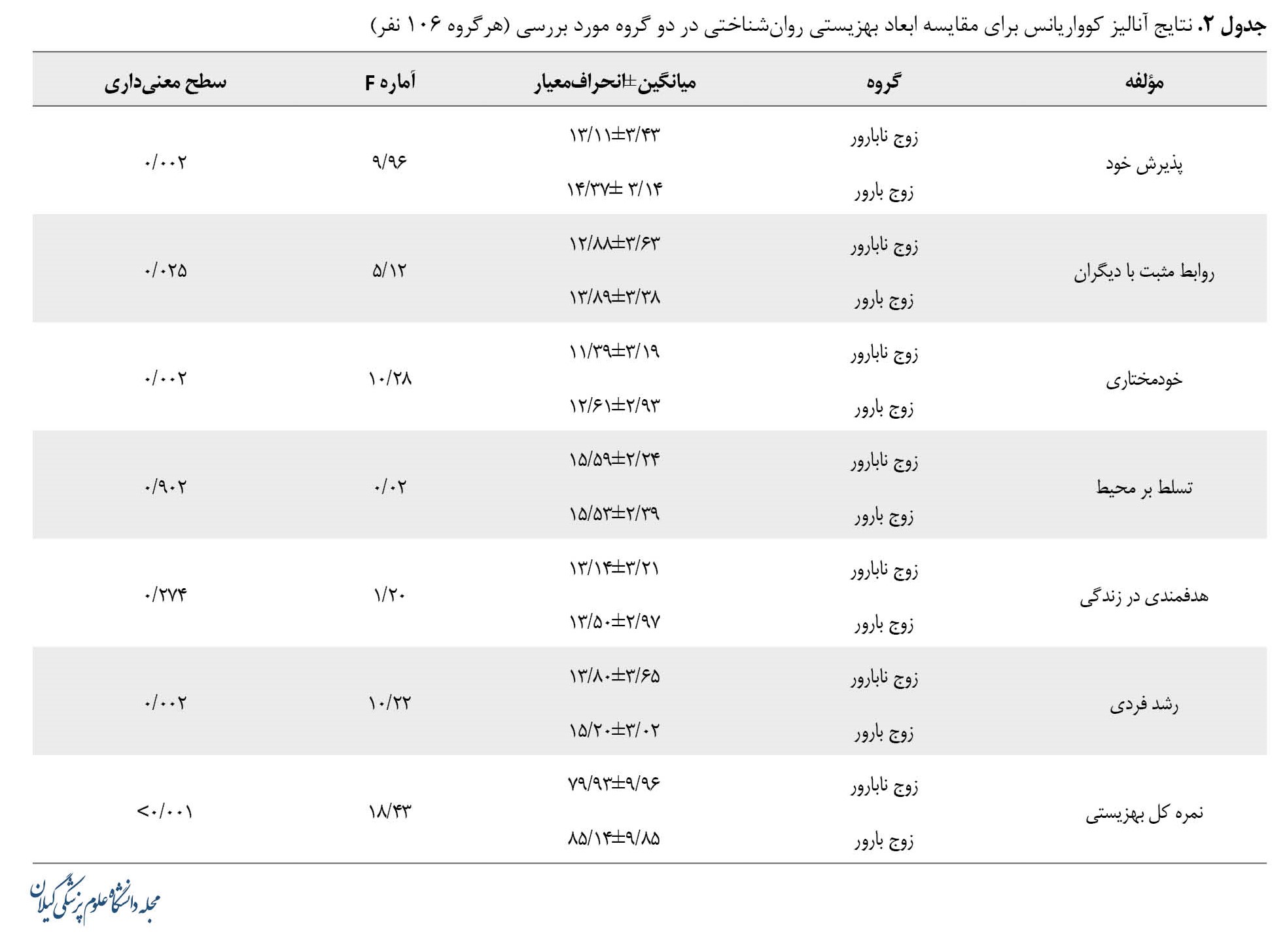 جدول شماره 2 به مقایسه مؤلفهها و نمره کل پرسشنامه بهزیستی روانشناختی، در