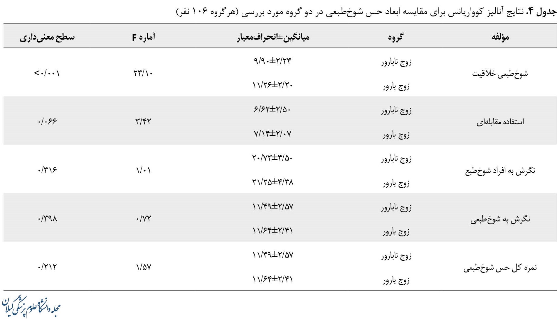 همچنین نتایج مطالعه حاضر نشان داد بعد شوخطبعی، خلاقیت و استفاده اجتماعی از شوخطبعی در زوجین بارور بیشتر از گروه نابارور است. نتایج مطالعه استوار و همکاران در رابطه با شوخطبعی در بین زوجهای نابارور نشان داد رابطه معنیداری بین شوخطبعی و خوشبینی با رضایت زناشویی و تأثیرپذیری در بین زوجهای نابارور وجود دارد. ازاینرو افرادی که از راهبردهای خوشبینی و شوخطبعی استفاده میکنند، شانس بیشتری برای دستیابی به رضایت زناشویی بهبودیافته، دارند [