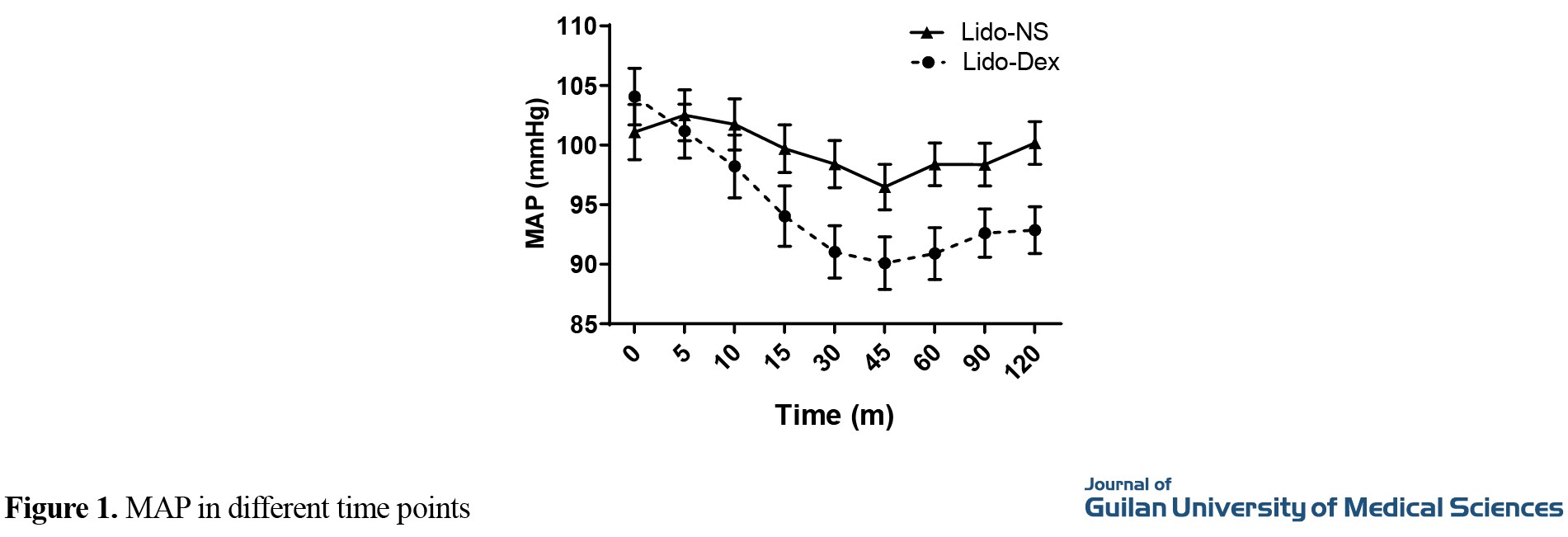 Participants were 61 patients with a mean age of 43.90±10.92 years. Most of them were male, and had a body mass index value of 25.80±2.80 kg/m2. Regarding the mean arterial pressure (MAP), results showed a significant difference between the two groups at all time points (P<0.001) except before the blockade and five minutes after the blockade (