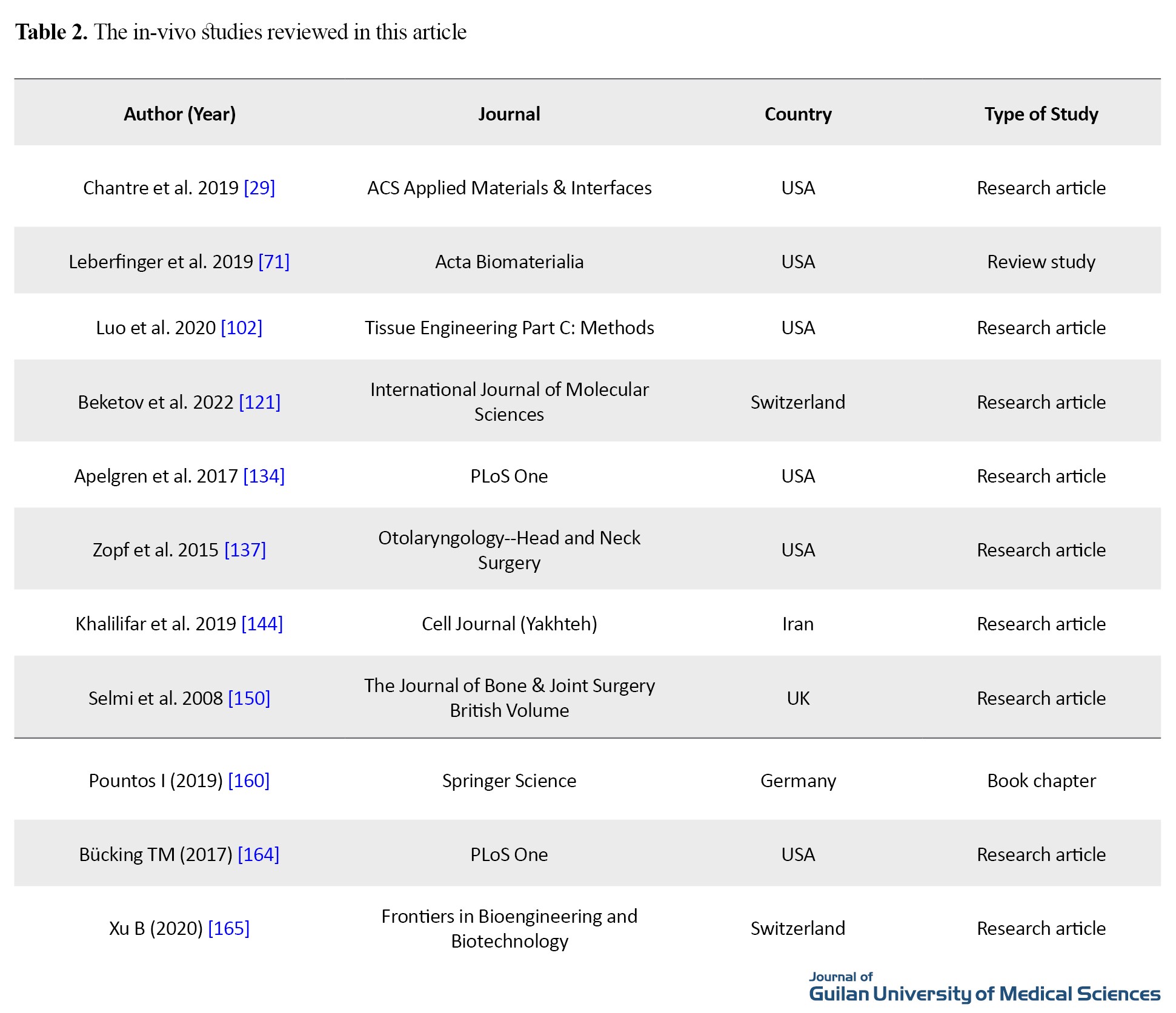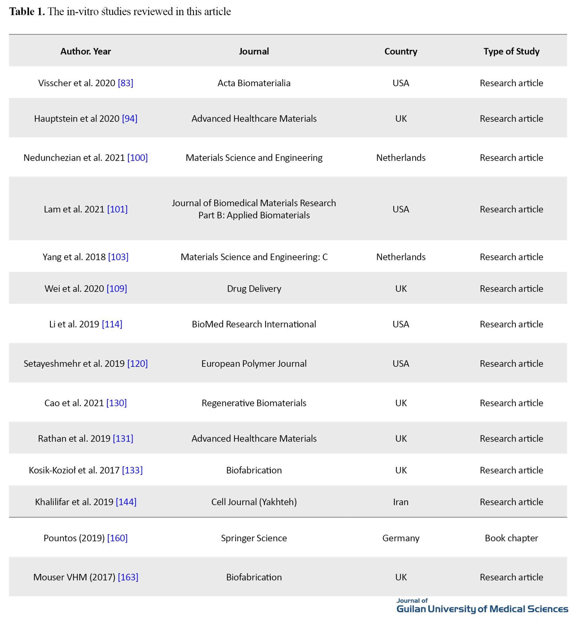 The review of studied showed that, in order to obtain the desired results in vitro or in vivo, choosing the appropriate bioprinting approach and biological ink has a major role. The most important studies with in-vitro tests are listed in
