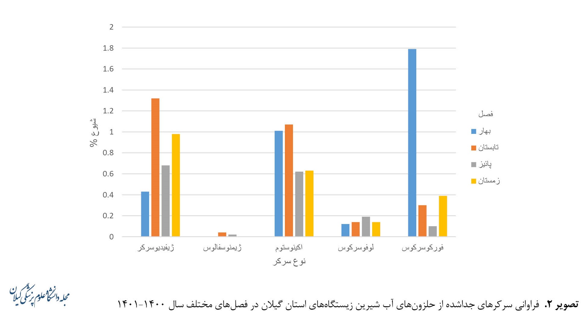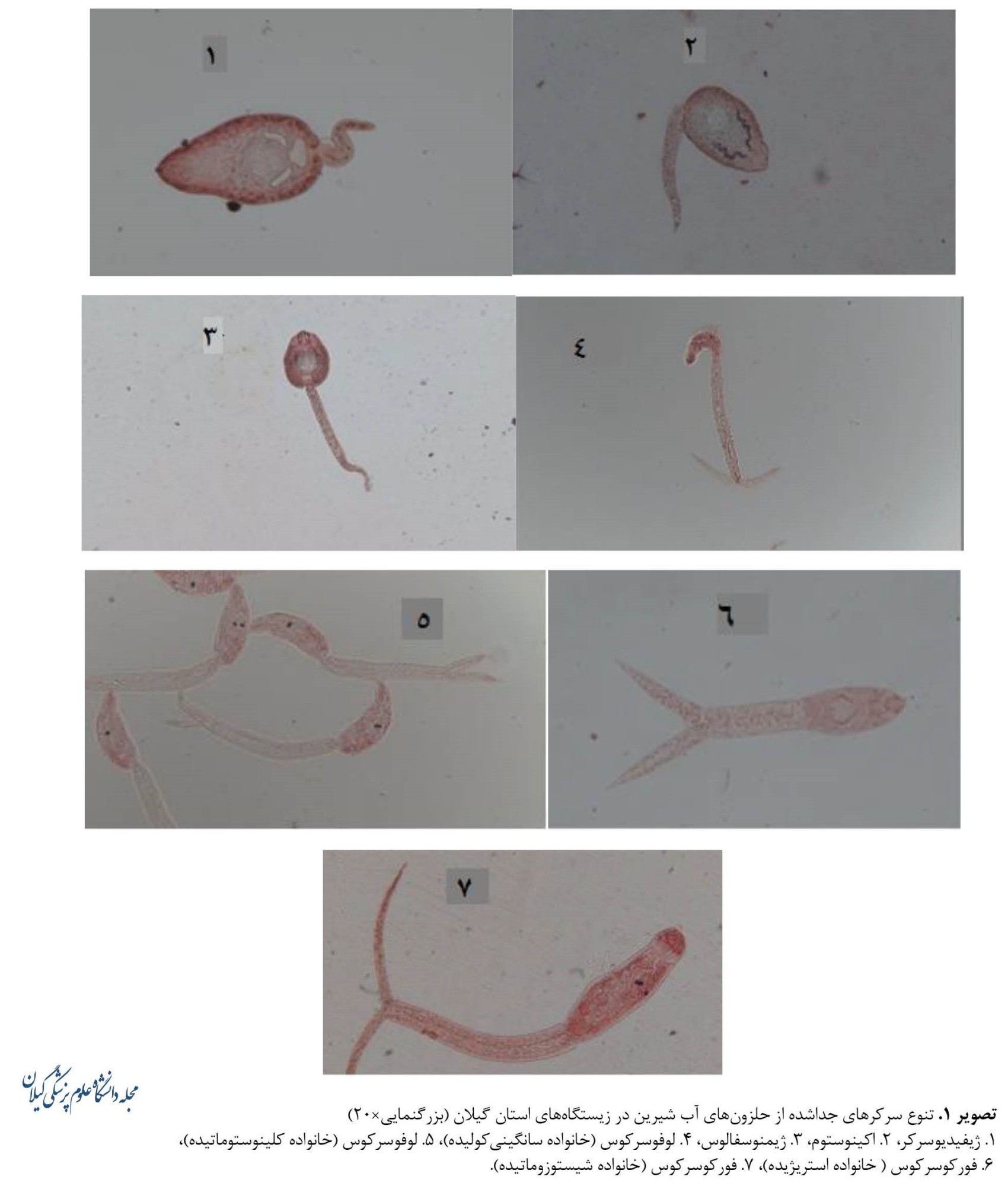تصویر شماره 1، سرکرهای شناساییشده از گروه ژیفیدیوسرکر (0/94 درصد)، ژیمنوسفالوس (0/02 درصد)، اکینوستوم (0/8 درصد)، لوفوسرکوس (0/16 درصد) و فورکوسرکوس (0/44 درصد) بودند.