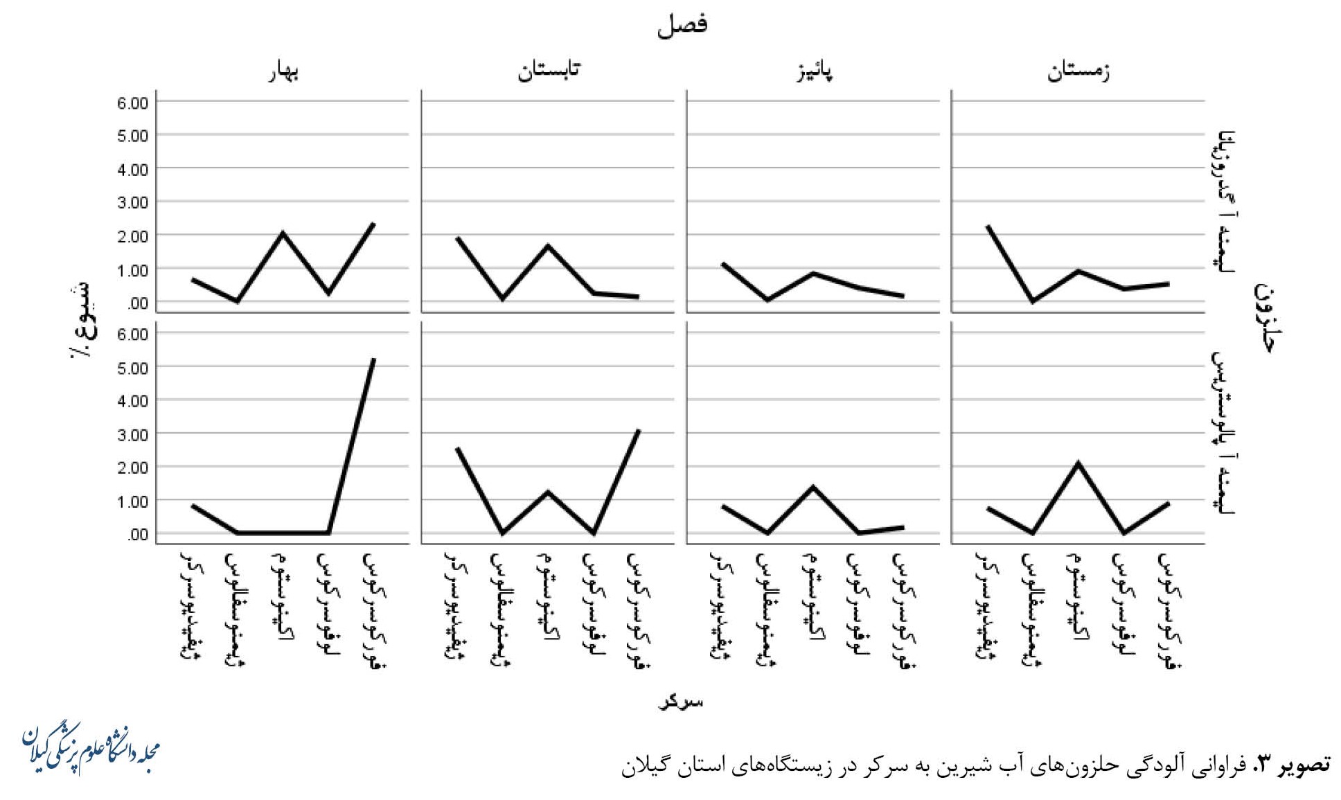در فصل بهار بیشترین فراوانی آلودگی در لیمنهآ اوریکولاریا به فورکوسرکوس (2/34 درصد)، لیمنهآ پالوستریس به فورکوسرکوس (5/23 درصد) بود. در فصل تابستان بیشترین فراوانی آلودگی در لیمنهآ اوریکولاریا به ژیفیدیوسرکر (1/91 درصد)، لیمنهآ پالوستریس به فورکوسرکوس (3/1 درصد) بود. در فصل پاییز بیشترین فراوانی آلودگی در لیمنهآ اوریکولاریا به ژیفیدیوسرکر (1/14 درصد)، لیمنهآ پالوستریس به اکینوستوم (1/37 درصد) بود. در فصل زمستان بیشترین فراوانی آلودگی در لیمنهآ اوریکولاریا به ژیفیدیوسرکر (2/27 درصد) و در لیمنهآ پالوستریس به فورکوسرکوس (2/58 درصد) بود (