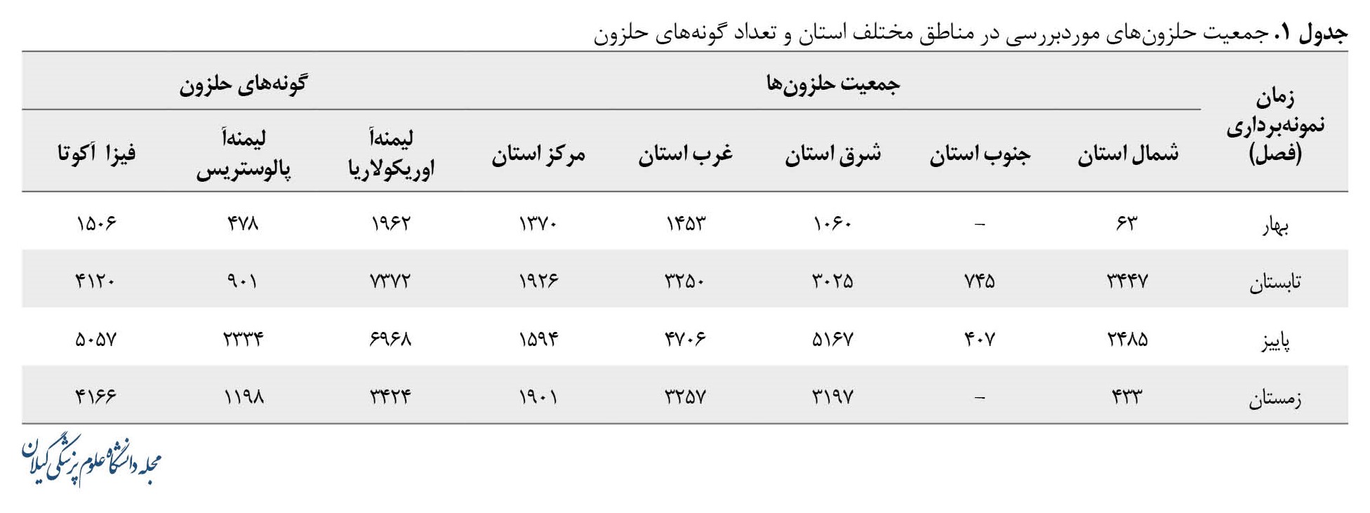 در این مطالعه از حلزونهای خانواده لیمنهایده دو گونه لیمنهآ اوریکولاریا (گونه غالب) و لیمنهآ پالوستریس و از خانواده فیزیده گونه فیزا آکوتا شناسایی شدند. بیشترین فراوانی حلزونهای شناساییشده در زیستگاههای استان گیلان در فصل پاییز بود. در استان گیلان گونه لیمنهآ ترانکاتولا علاوهبر گونههای لیمنهآ اوریکولاریا و لیمنهآ پالوستریس نیز گزارش شده است. باتوجهبه مطالعه اشرفی و همکاران ازآنجاییکه زیستگاه اصلی لیمنهآ ترانکاتولا در گیلان در مناطق کوهستانی و ییلاقی میباشد و چون در این مطالعه از این مناطق نمونهبرداری نشده است، بنابراین این گونه در زمره حلزونهای موردمطالعه نبود [
