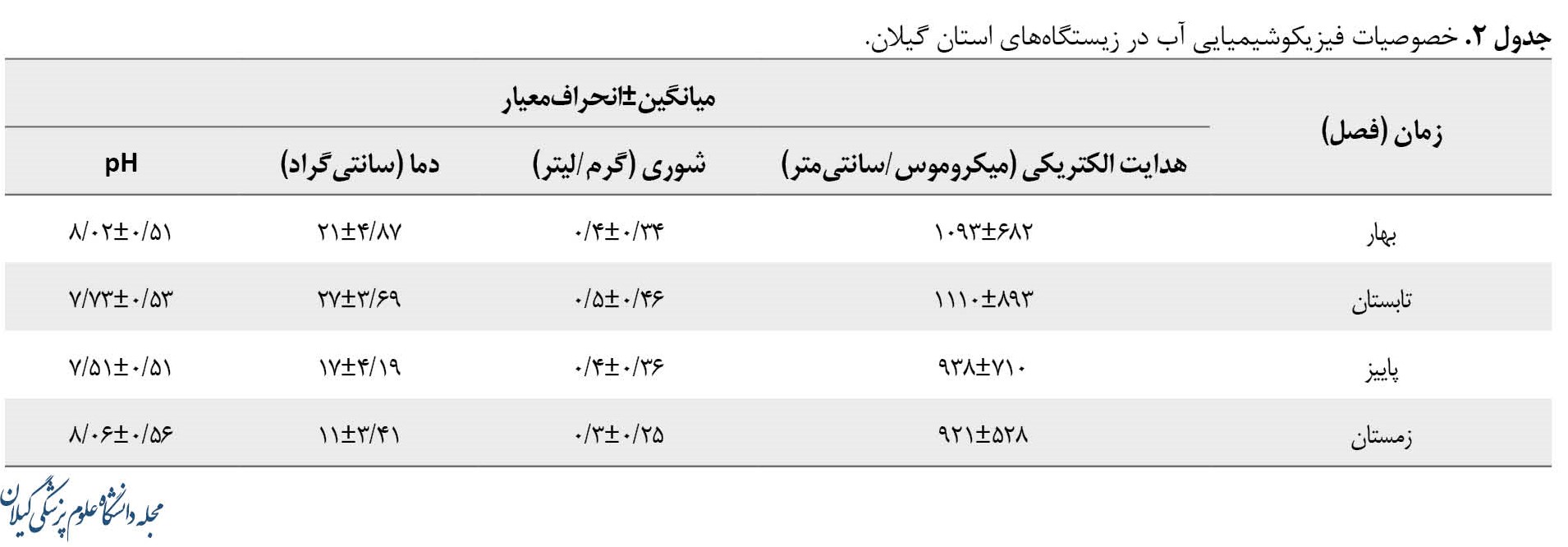 خصوصیات فیزیکوشیمیایی آب در فصول مختلف سال در زیستگاههای مختلف استان گیلان ثبت شده است (