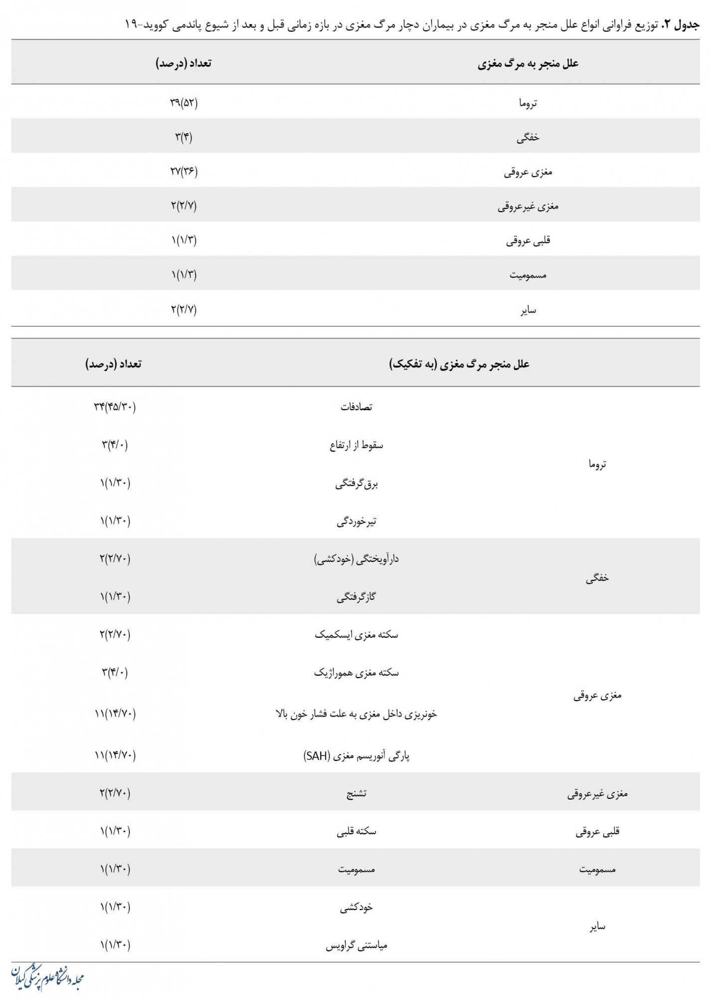 تروما و علل مغزی عروقی شایعترین علت منجر به مرگ مغزی را تشکیل میدادند. از میان علل ترومای منجر به مرگ مغزی به تفکیک، تصادفات و از میان علل قلبی عروقی به تفکیک، خونریزی داخل مغزی بهدلیل فشار خون بالا و پارگی آنوریسم مغزی شایعترین علل را تشکیل میدادند (