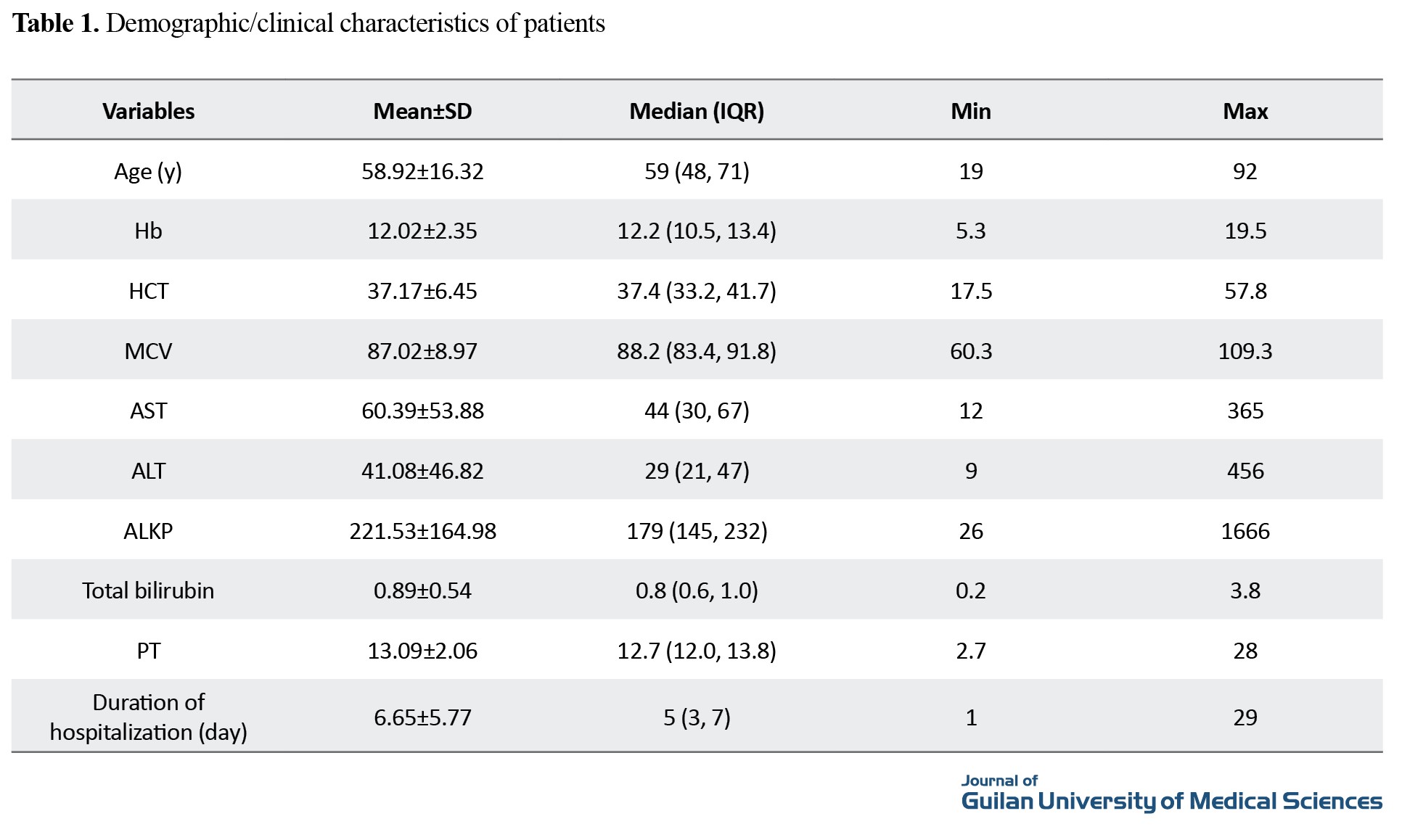 This cross-sectional analytical study was conducted on patients with COVID-19 hospitalized at Razi Hospital in Rasht, northern Iran, during 2021, whose COVID-19 was confirmed by RT-PCR testing. Using a convenience sampling method, 195 were included in the study. Demographic information and some red blood cell parameters, including Hb, HCT, MCV and some LFTs such as AST, ALT, ALKP, Total bilirubin and PT, were recorded from the patient’s file. Patient outcomes were recovery or discharge from the hospital, death, and length of hospitalization. Mean±SD were used to describe quantitative variables and frequency and percentage were used to describe qualitative variables. Shapiro-Wilk test was used to check the normality of the data. Mann-Whitney U test and Spearman correlation test were used to examine the relationship between quantitative variables. The significance level was set at 0.05.