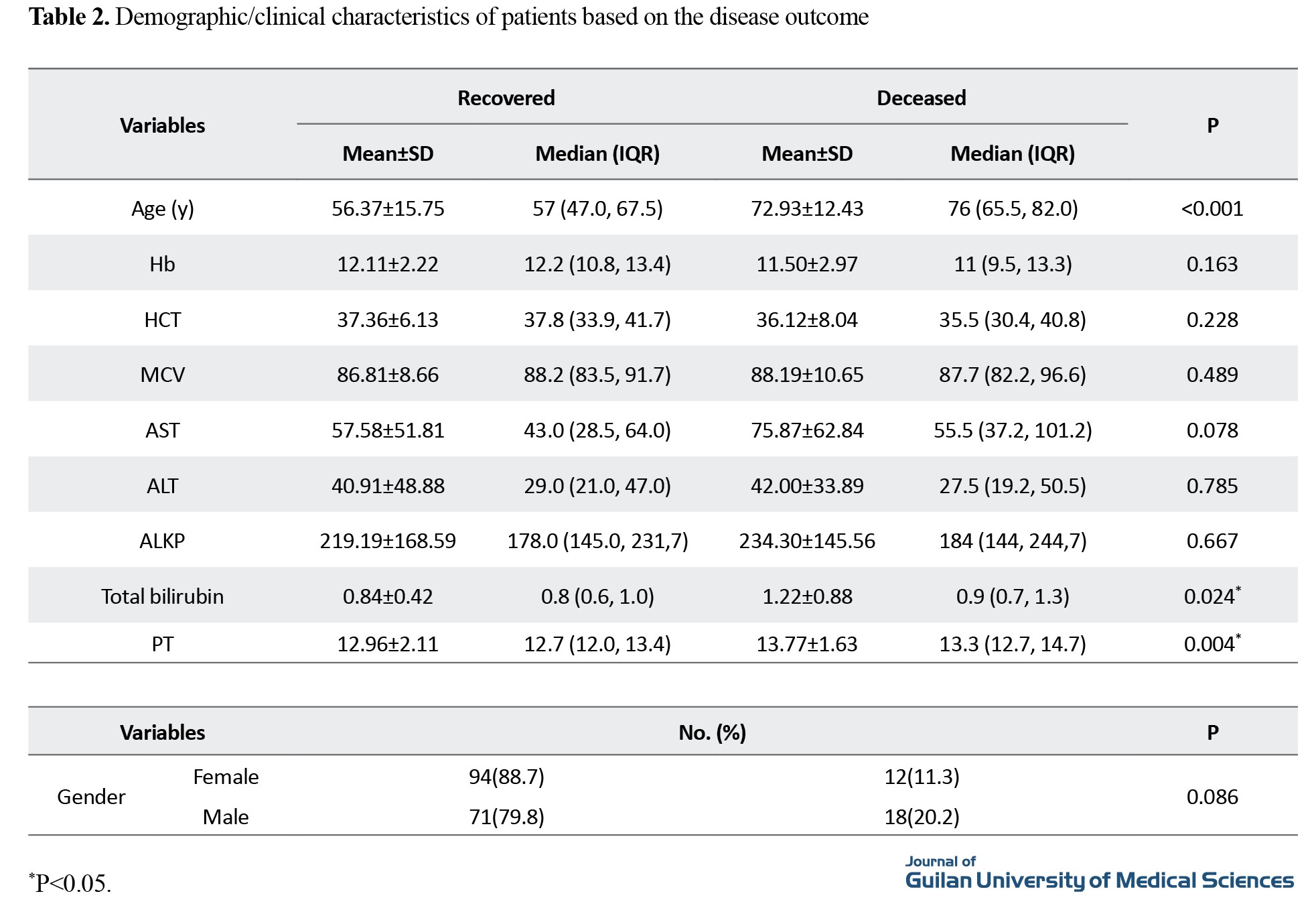 17, 18]. Studies on the association of some LFTs and red blood cell parameters with the final outcome (recovery versus death) in COVID-19 patients, especially in Iran, have been limited. Therefore, this study aimed to investigate the relationship between some laboratory factors, such as LFTs and red blood cell parameters, and the outcome of patients with COVID-19 hospitalized at Razi Hospital in Rasht, northern Iran.