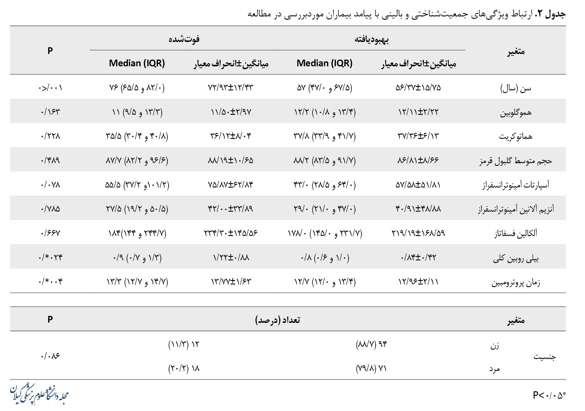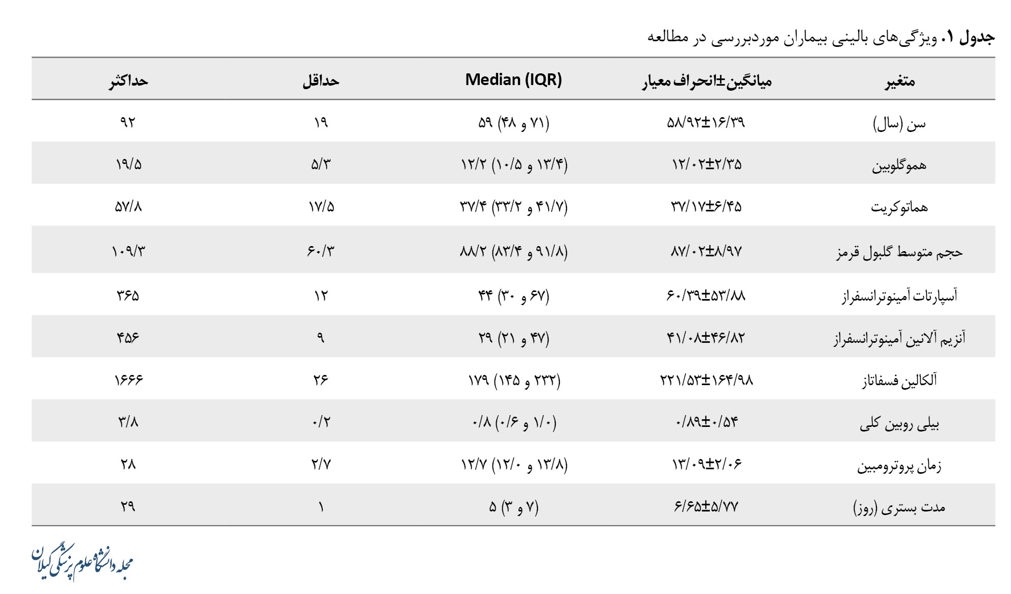 اطلاعات جمعیتشناختی و برخی آزمایشات، مانند پارامترهای گلبولهای قرمز شامل حجم متوسط گلبول قرمز، هماتوکریت و هموگلوبین و بعضی تستهای عملکرد کبد، مانند آسپارتات آمینوترانسفراز، آنزیم آلانین آمینوترانسفراز، زمان پروترومبین، بیلی روبین و الکالین فسفاتاز که در پرونده بیمار موجود بود ثبت شد. پیامد بیمار بهصورت بهبودی و یا ترخیص از بیمارستان، مرگ و همچنین طول مدت بستری در بیماران بررسی شد. بیماران مبتلا به بیماریهای شناختهشده زمینهای، مانند سرطانهای خونی و غیرخونی و همچنین بیماریهای شناختهشده کبدی، نظیر انواع هپاتیت که میتواند در آزمایشات شاخصهای گلبول قرمز و تستهای کبدی تد اخل کند از مطالعه خارج شدند. دادههای ثبتشده در نرمافزار SPSS تحلیل شدند. از میانگین و انحراف معیار برای توصیف متغیرهای کمی و از تعداد و درصد برای توصیف متغیرهای کیفی استفاده شد. برای بررسی نرمال بودن دادهها از آزمون شاپیروویلک استفاده شد. برای بررسی ارتباط بین متغیرهای کمی از آزمون منویتنی و ضریب همبستگی اسپیرمن استفاده شد. سطح معنیداری 0/05 در نظر گرفته شد.