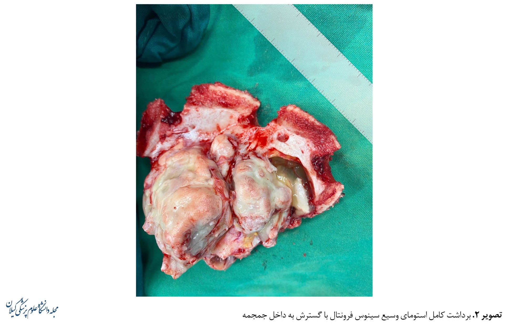 بعد از برداشت تومور، استخوان حفره جمجمه قدامی چپ و دیواره خلفی سینوس فرونتال و قاعده جمجمه به شکل کامل بازسازی شد.