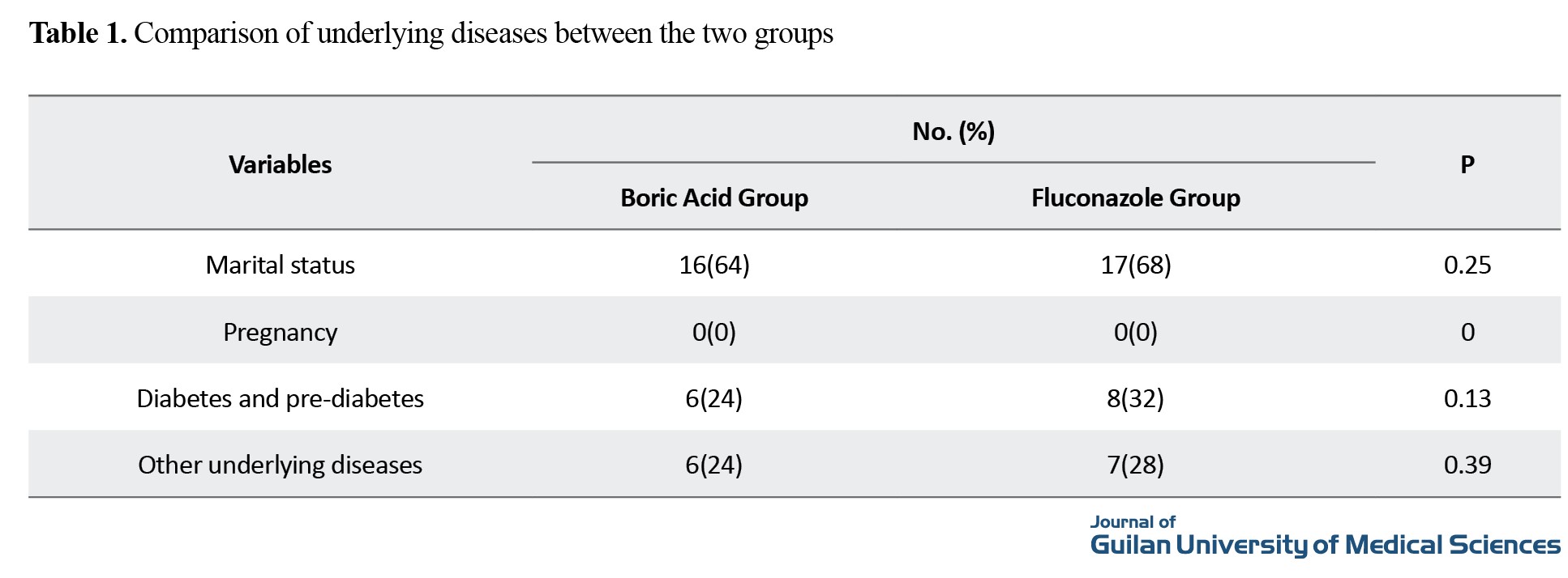 The mean age in the boric acid group was 32±5.88 years, and in the fluconazole group as 31.5±3.85 years. The body mass index was 27.9 in the boric acid group and 27.1 in the fluconazole group. The comparison of underlying diseases is shown in