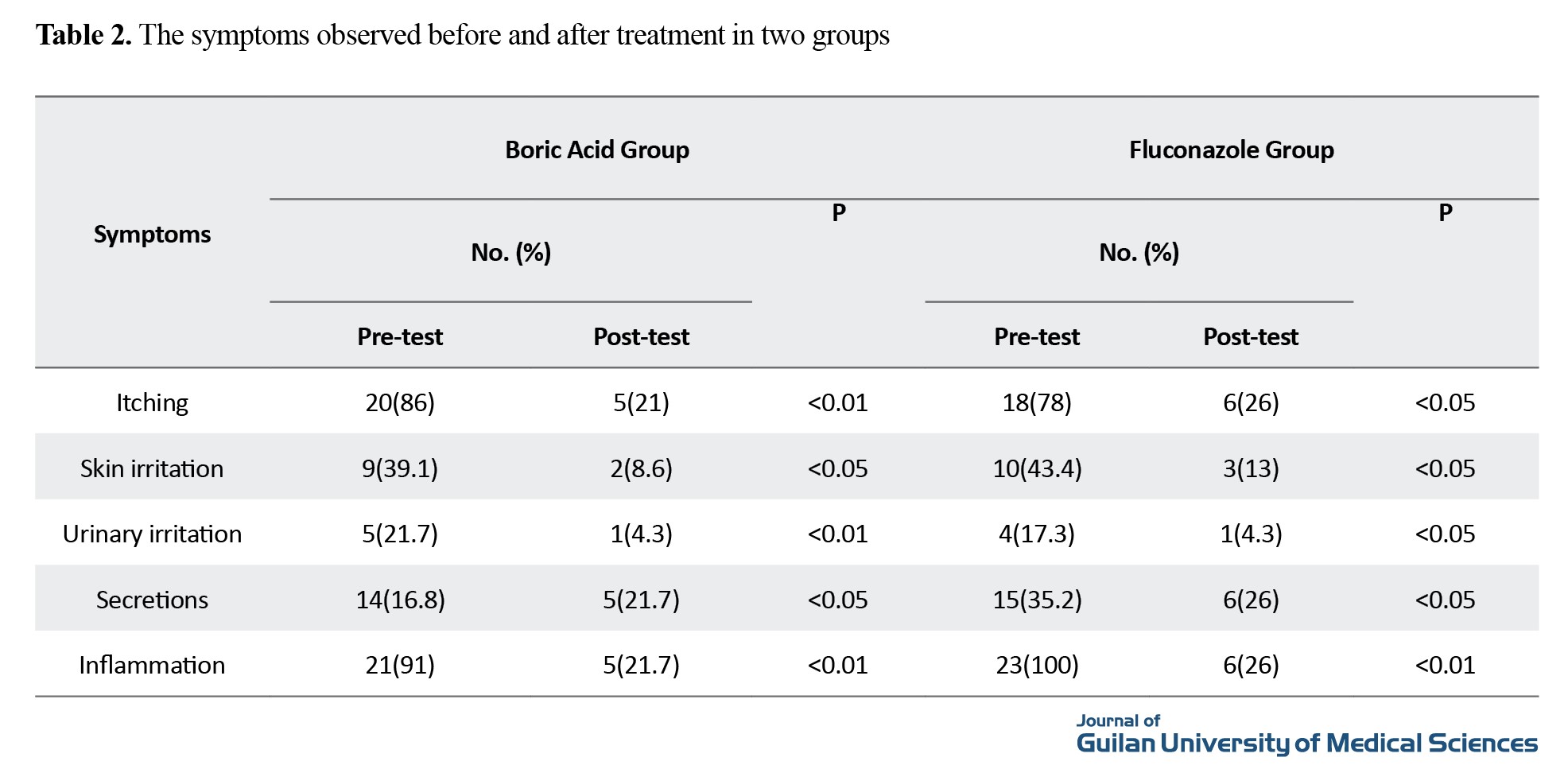 Table 1, and the prevalence of symptoms before and after treatment in both groups is shown in