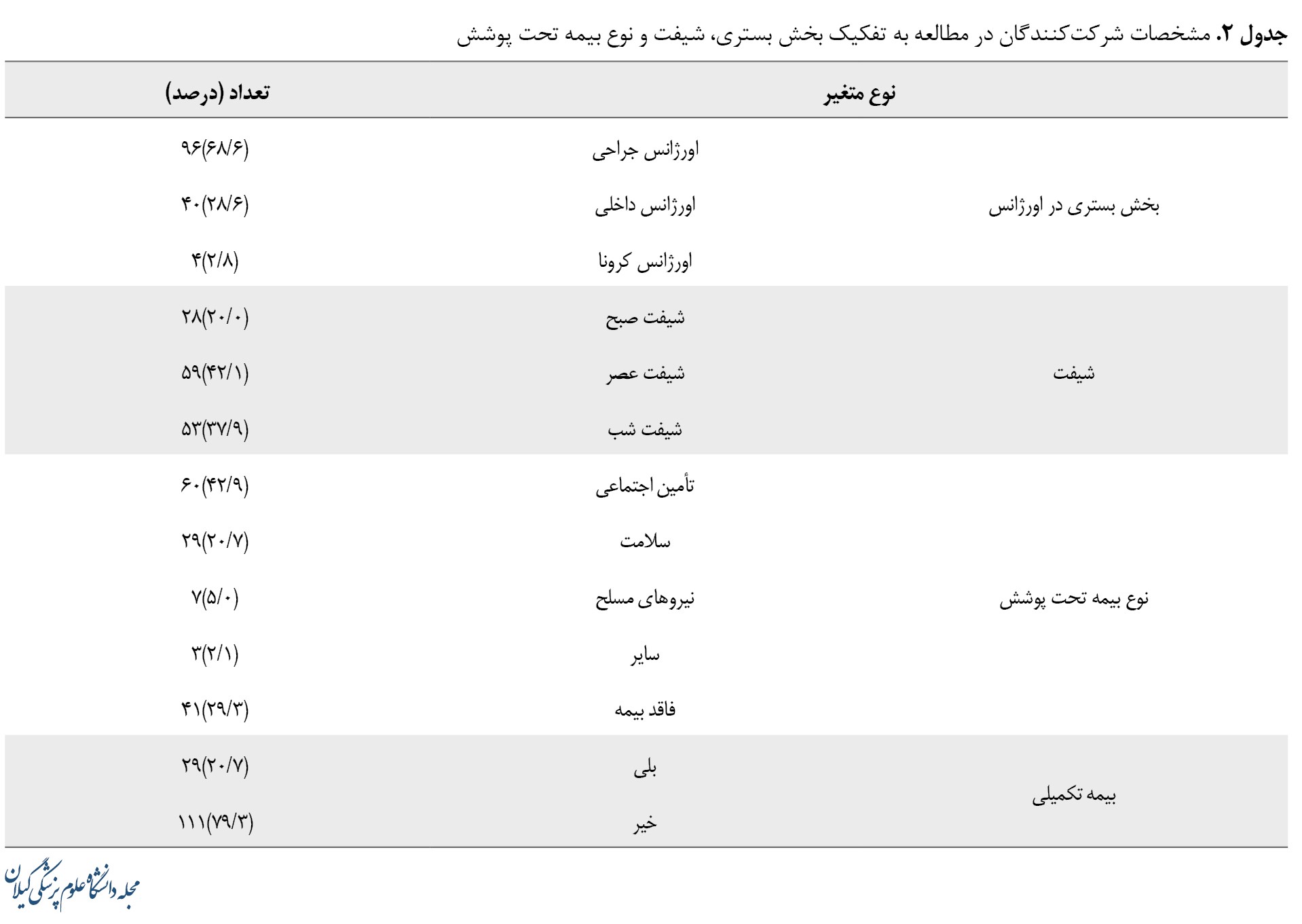 از مجموع تعداد افردی که ترخیص با رضایت شخصی داشتهاند، 96 نفر (68/6 درصد) در اورژانس جراحی، 40 نفر (28/6 درصد) در اورژانس داخلی و 4 نفر (2/8 درصد) در اورژانس کرونا بودهاند. در شیفت صبح 28 نفر (20 درصد)، در شیفت عصر 59 نفر (42/1 درصد) و در شیفت شب 53 نفر (37/9 درصد) با رضایت شخصی ترخیص شده بودند. از این تعداد 60 نفر (42/9 درصد) تحت پوشش سازمان تأمین اجتماعی، 29 نفر (20/7 درصد) تحت پوشش بیمه سلامت، 7 نفر (5 درصد) دارای بیمه نیروهای مسلح و 3 نفر (2/1 درصد) تحت پوشش سایر بیمهها بودند؛ درحالیکه 41 نفر (29/3 درصد) تحت پوشش هیچ بیمهای نبودند. همچنین 29 نفر (20/7 درصد) از افراد موردمطالعه دارای بیمه تکمیلی بودند (