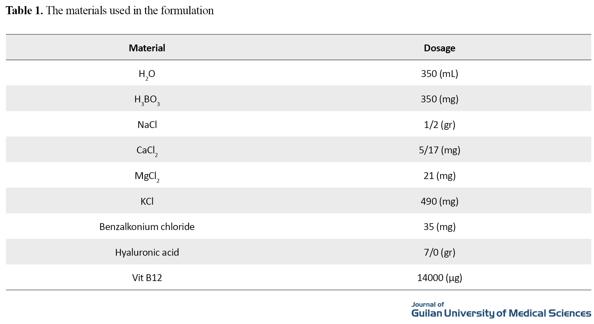 Vitamin B12 was obtained from Raha Pharmaceutical Company (Iran). Hyaluronic acid, boric acid and benzalkonium chloride were obtained from Sigma Aldrich Company (USA). The rest materials were obtained from Merck Company (Germany). To prepare eye drops containing 40 µg/ml vitamin B12 and 0.2% hyaluronic acid, the materials shown in