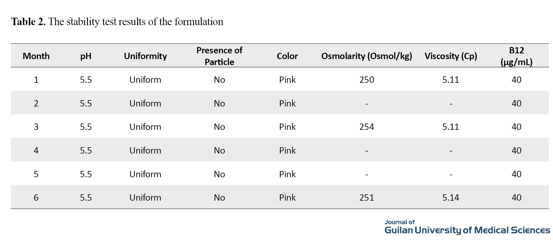 UV spectroscopy was used to check the changes in the concentration of vitamin B12 in the prepared formulation. The efficacy of the protective agent (benzalkonium chloride) was investigated according to the USP 43 pharmacopoeia and using the services of the Food and Drug Laboratory (Tavan Institute, Iran) after 6 months of stability testing. To check the stability of the prepared formulation, the eye drops were kept at a temperature of 40 and a humidity of 75% for 6 months. During this period, properties such as color, uniformity, the presence of particles in the formulation, the amount of B12 based on UV absorption, and the amount of osmolarity and viscosity were examined every month, and at the end of the study, the effectiveness of the protective agent was tested.