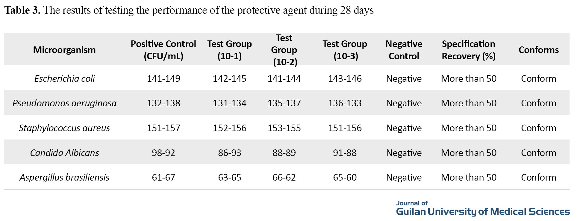 Table 3, the selected protective agent (benzalkonium chloride) in the prepared concentration can be a suitable option to protect the ophthalmic formulation and the results are in accordance with the USP pharmacopoeia.
