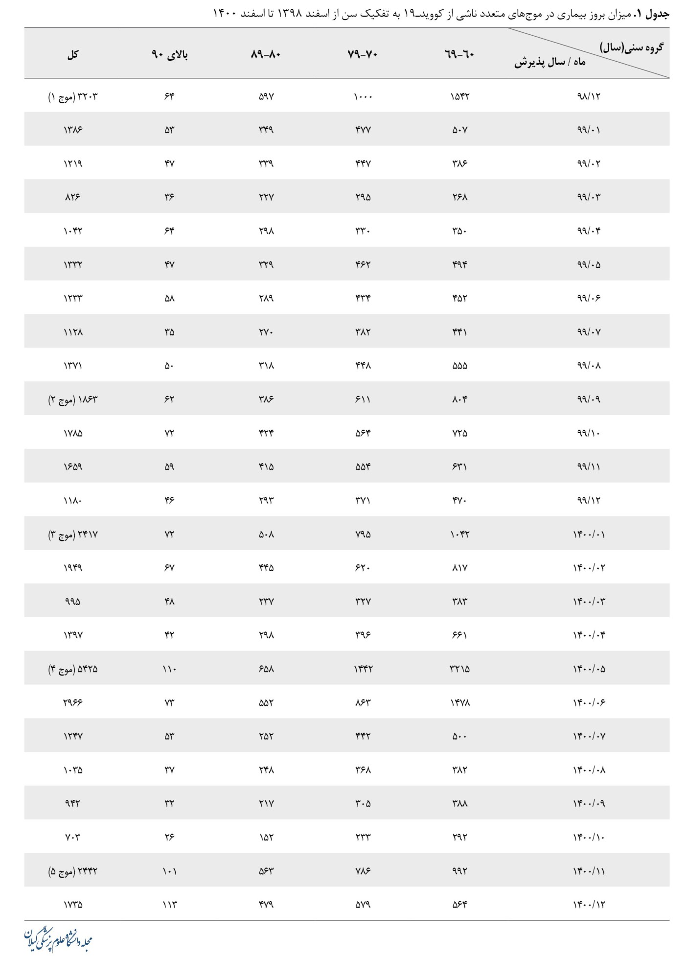 جدول شماره 1 نشان میدهد که ۵ موج بیمار بستری سالمند مبتلا به کوویدـ۱۹ در طی این 2 سال پاندمی در گیلان بروز کرده است که اولین موج مربوط به اسفند 1398 با ۳۲۰۳ نفر بستری بود. دومین موج مربوط به آذر سال ۱۳۹۹ با ۱۸۶۳ نفر بستری بود که از موج قبلی تعداد بستری کمتری داشته و ضعیفترین پیک است. پیک سوم در فروردین ۱۴۰۰ با ۲۴۱۷ نفر بیمار بستری بروز کرده و پیک چهارم در مرداد سال ۱۴۰۰ با ۵۴۲۵ نفربیمار بستری بوده که شدیدترین پیک بوده است و پیک پنجم مربوط به بهمن ماه سال ۱۴۰۰ با ۲۴۴۲ نفر بستری بوده است. بیشترین تعداد بستری در هر پیک، مربوط به بازه سنی ۶۰ تا ۶۹ سال بوده و کمترین تعداد بستری مربوط به بازه سنی بالای ۹۰ سال بوده است (