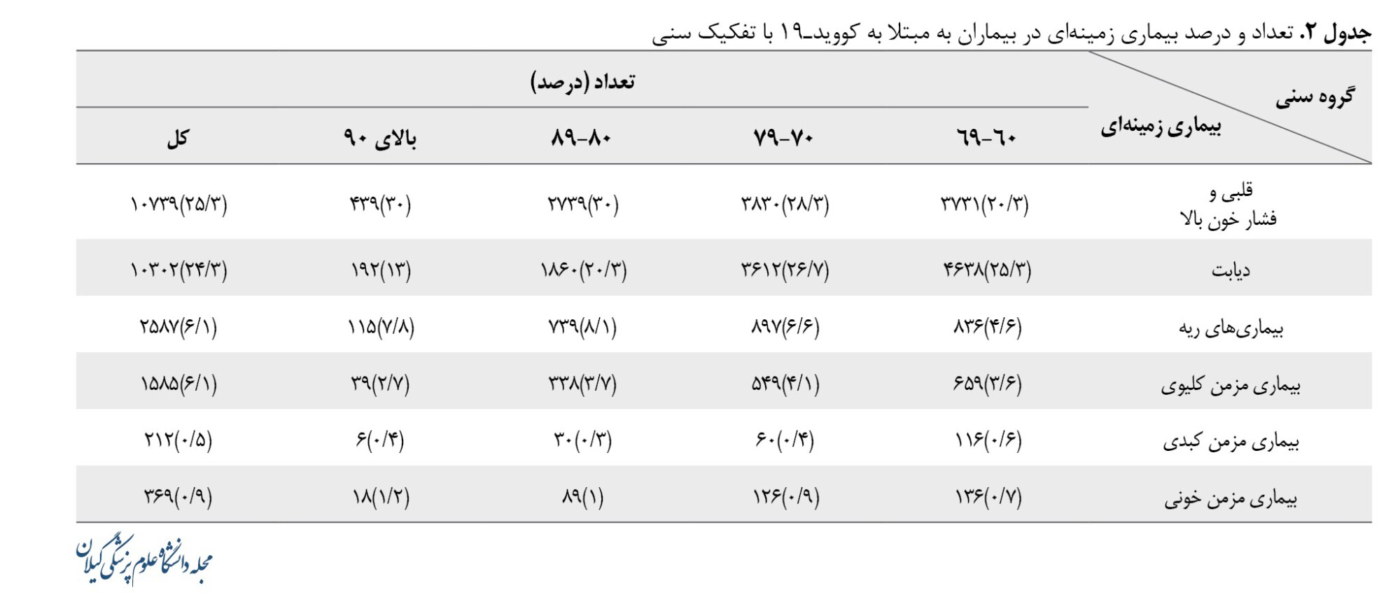 جمعیت بالای ۶۰ سال استان گیلان ۴۶۵۴۸۷ نفر بودند. گروهه سنی ۶۰ تا ۶۹ سال استان ۲۷۱۵۷۸ نفر بودند که ۱۸۳۴۲ نفر با فراوانی۶/۷۵ درصد، ۷۰ تا ۷۹ سال ۱۳۱۴۱۱ نفر بودند که ۱۳۵۳۱ نفر با فراوانی۱۰/۳۰ درصد، 80 تا 89 ساله ۵۲۸۰۱ نفر بودند که ۹۱۴۳ نفر با فراوانی ۱۷/۳۲ درصد و بالای ۹۰ سال ۹۸۰۷ نفر بودند که ۱۴۶۵ نفر با فراوانی۱۴/۹۴ درصد با تشخیص کوویدـ۱۹ در مراکز درمانی استان گیلان بستری بودهاند. با افزایش سن، فراوانی بستری بیماران سالمند افزایش مییابد. این یافتهها باتوجهبه جمعیت سالمندان در استان گیلان قابلتوجیه است.