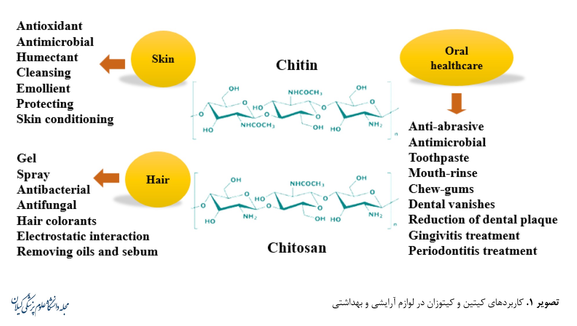 تصویر شماره 1 به برخی کاربردهای کیتین و کیتوزان در لوازم آرایشی و بهداشتی اشاره دارد.