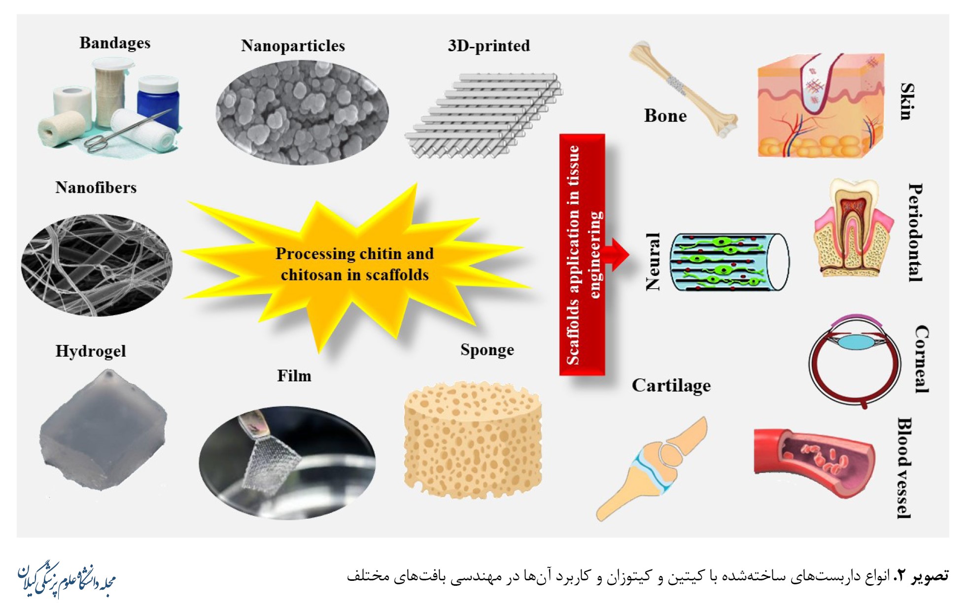 مهندسی بافت حوزهای پیشرفته از پزشکی ترمیمی و بازساختی است که از زمینه بیومواد پدید آمده است. اساساً این تکنیک با ترکیب سلولها، مولکولهای فعال بیولوژیکی و داربستها، عملکرد بافت یا اندام آسیبدیده را بهبود میبخشد ترمیم و حفظ میکند. هدف مهندسی بافت گرد هم آوردن ساختارهای عملکردی است که حمایت بیولوژیکی از بافت / اندام آسیبدیده برای ترمیم و بازسازی مناسب آن را فراهم میکند [66، 67]. استفاده از کامپوزیتهای پلیمری در درمان آسیبهای بافتی توجه زیادی را در بالین به خود جلب کرده است که دانشمندان را وادار به بهبود روشهای طراحی پلیمرهای زیستی بهمنظور دستیابی به سیستمی کارآمد برای ترمیم کامل بافت آسیبدیده کرده است. در مهندسی بافت، بیومتریال بهعنوان یک ماتریکس خارجسلولی برای سلول عمل میکند و به اتصال، تکثیر و تمایز سلولهای زنده کشت دادهشده کمک میکند [68]. بنابراین یکی از راههای مهم انتخاب بیومواد برای مهندسی بافت نهتنها باید انتقال فعال جمعیت سلولی و عوامل درمانی باشد و بازسازی را ارتقا بخشد، بلکه باید داربستی باشد که استحکام مکانیکی کافی برای بافت هدف را فراهم کند. علاوهبراین در حالت ایدئال، ماده باید در محل پیوند با سرعت قابلقبولی در مقایسه با رشد بافت تخریب شود [69]. کیتوزان یک ماده بیولوژیکی است و دومین پلیمر فراوان پس از سلولز است. این ماده پلیمر کاتیونی است که از کیتین با فرایند استیلزدایی نسبی به دست آمده و کاندیدی مناسب برای کاربردهای مهندسی بافت براساس ویژگیهایی مانند زیستسازگاری، غیرسمی و زیستتخریبپذیری همراه با فعالیت هموستاتیک و خونسازگار است که خواص بیولوژیکی آن مانند ضدمیکروبی، آنتیاکسیدانی، ضدسرطانی و ضدالتهابی بودن ثابت شده است [70]. در مطالعات مختلف گزارش شده که کیتوزان، به دلیل گروههای عملکردی آن، میتواند بهراحتی با سایر مولکولهای زیستفعال اصلاح شود تا خواص بیشتری به ساختار بافت بدهد. علاوهبراین مولکولهای کیتوزان رشد و تکثیر سلولهای سهبعدی را تسهیل کرده و همچنین رسوب کلاژن را سازماندهی میکنند و درنتیجه بهبودی سریع را تضمین میکند [71]. تا به امروز معمولاً از غشاها / فیلم، هیدروژل، اسفنج و اشکال رشتهمانند کیتوزان برای ترمیم زخم و یا سایر کاربردهای مهندسی بافت استفاده شده است (