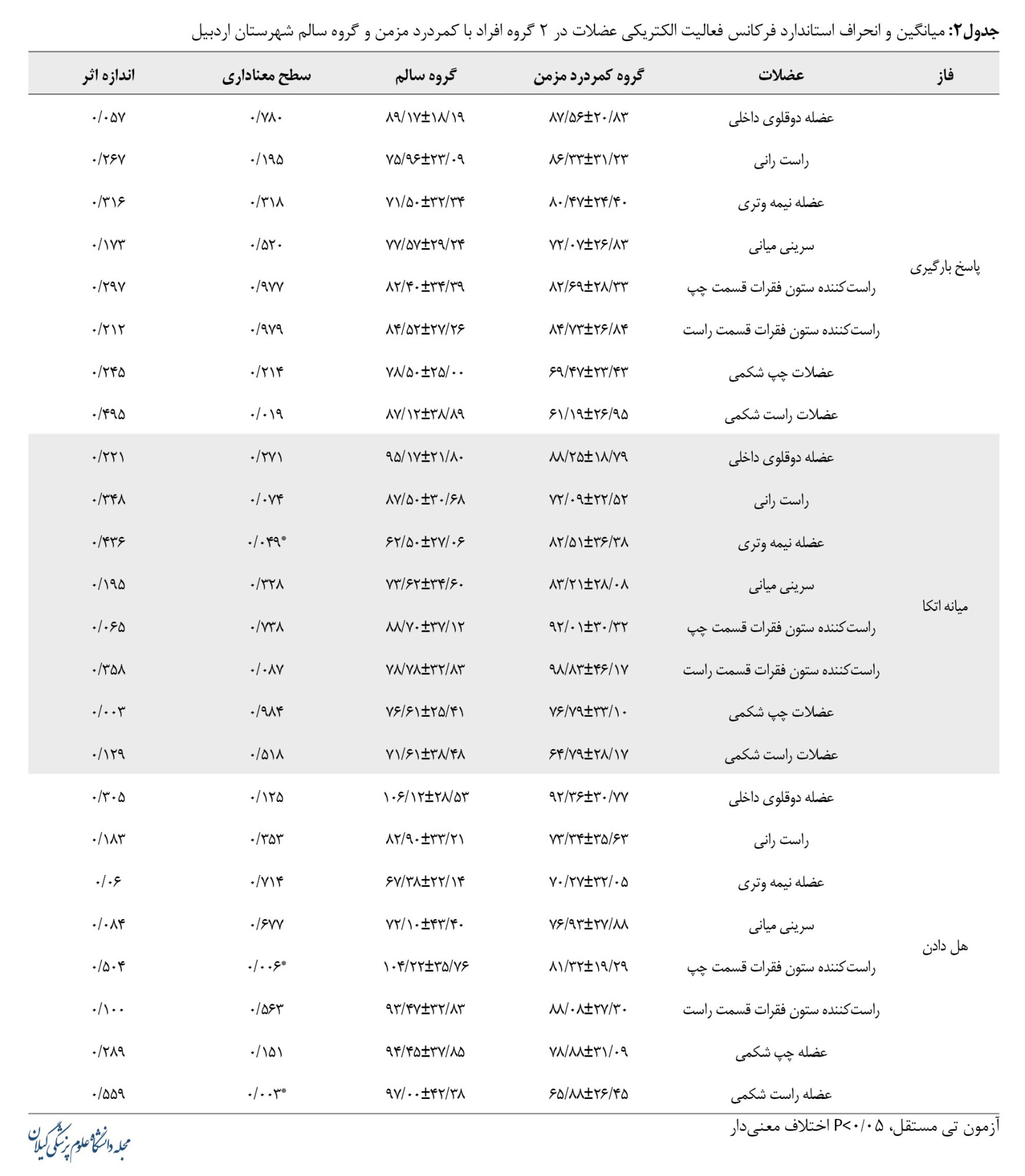 جدول شماره 2 نتایج تفاوت معناداری در فرکانس فعالیت الکتریکی عضله راست شکمی در مرحله فاز پاسخ بارگیری طی راه رفتن در هر دو گروه را نشان داد (0/019=P).