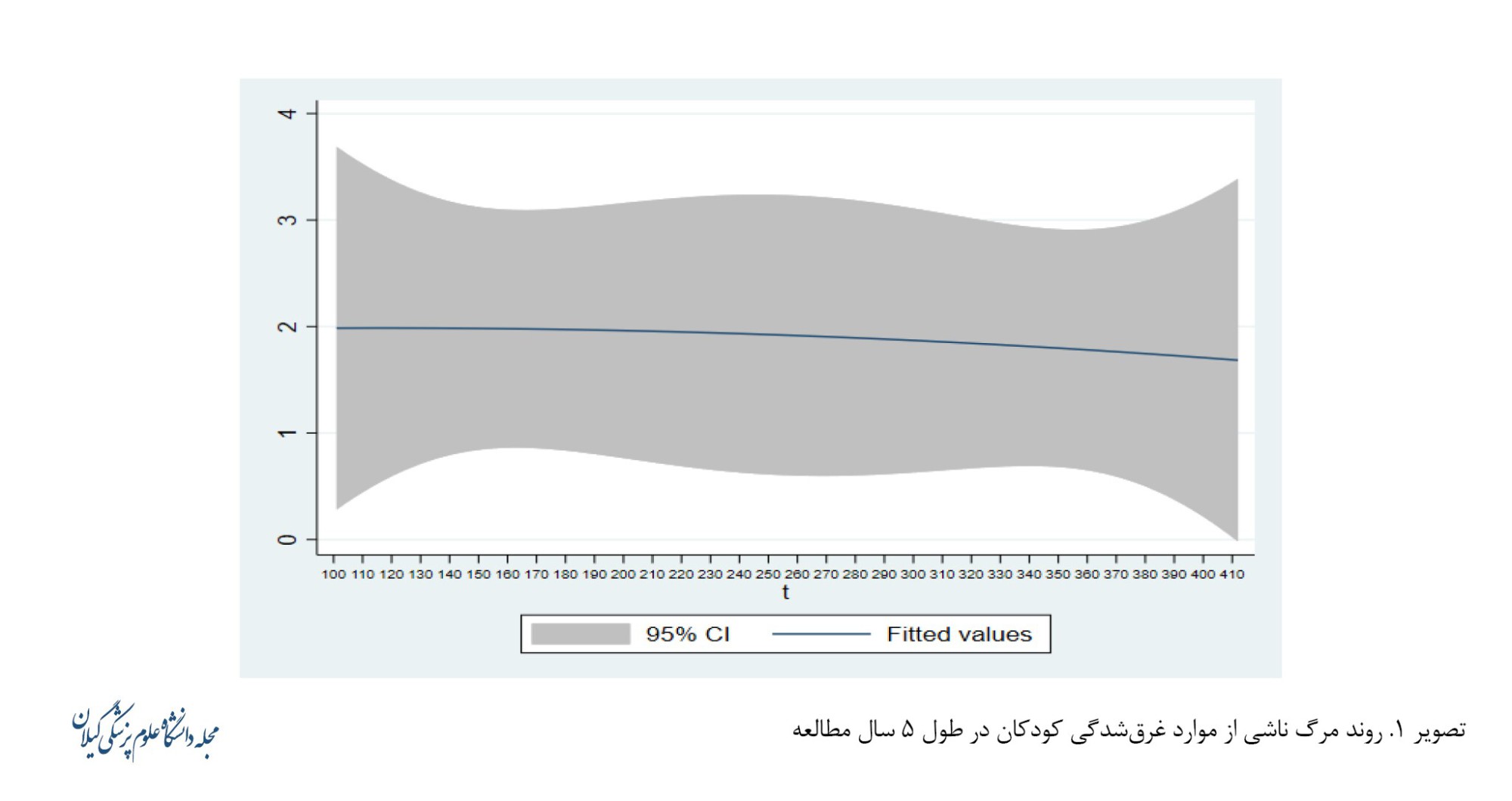 تحلیل دادهها با استفاده از مدل روند آنالیز ARMA در تصویر شبیهسازیشده شماره 1 موارد غرقشدگی کودکان زیر ۱۵ سال تمام نشان داد موارد مرگومیر ناشی از غرقشدگی با روند بسیار بسیار کندی در طول دوره مطالعه کاهش یافته است.