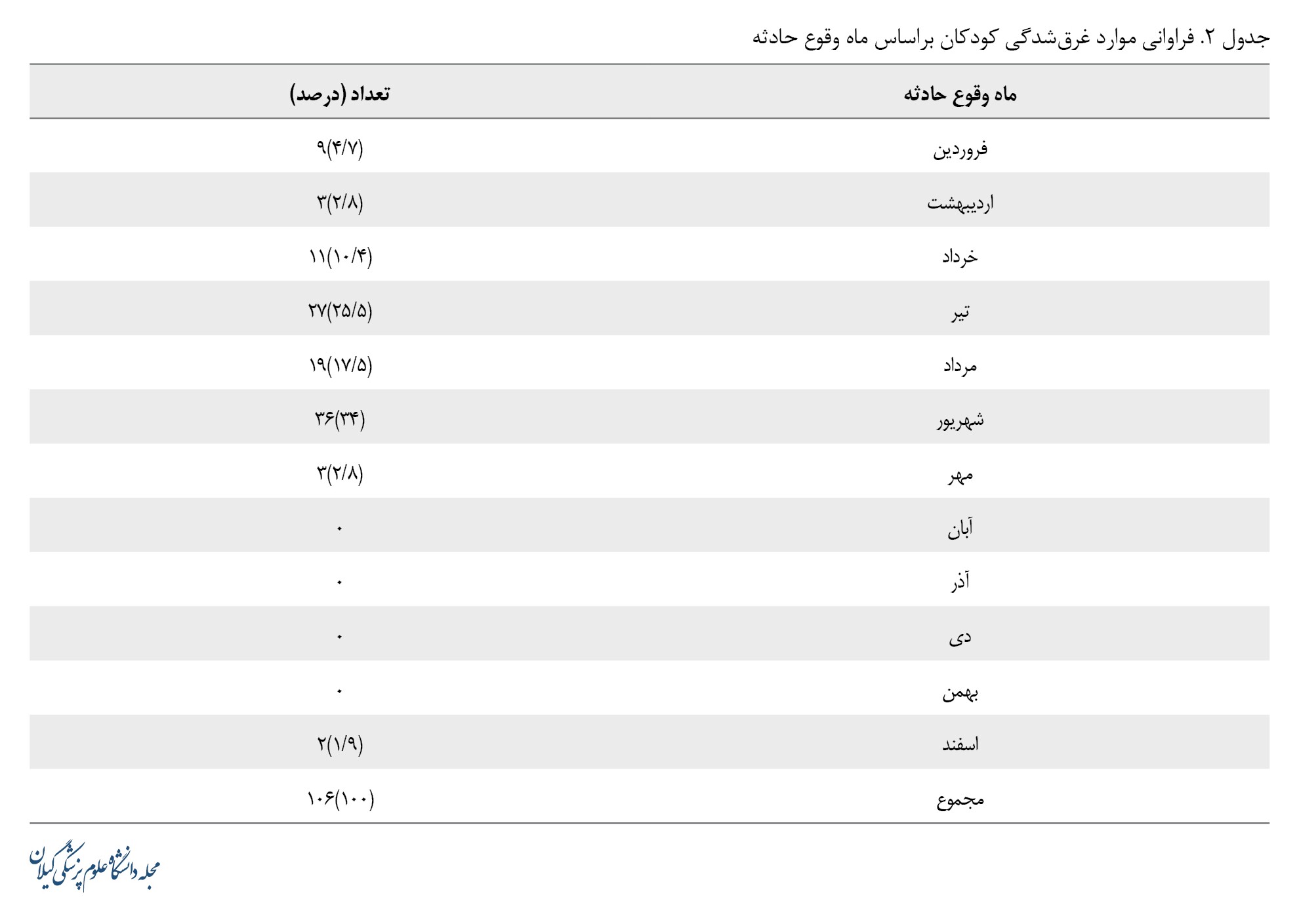 دادههای این مطالعه همچنین نشان داد بیشترین فراوانی غرقشدگی در ماههای فصل تابستان (تیر، مرداد و شهریور) و کمترین فراوانی غرقشدگی نیز در فصل زمستان (دی، بهمن و اسفند) اتفاق افتاده است (جدول شماره ۲).